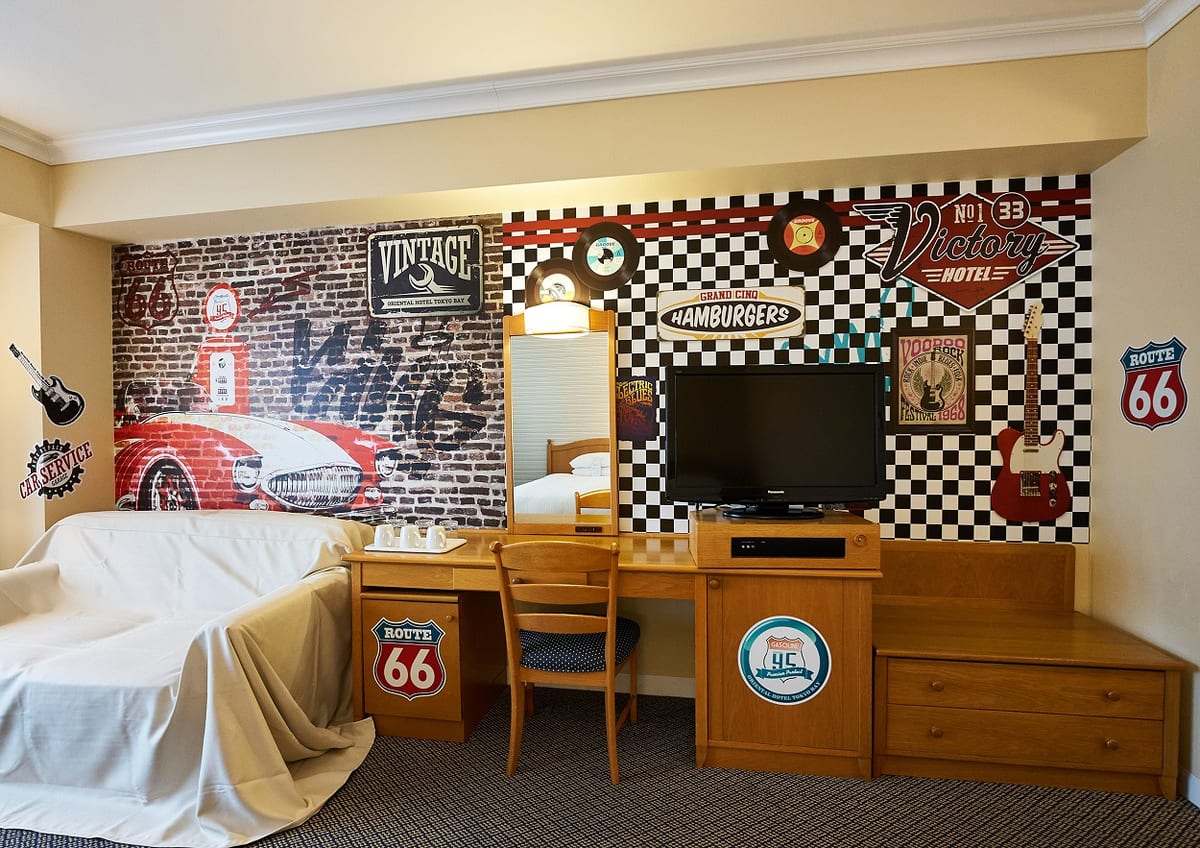 ファミリーにおすすめの客室に、ポップなロックンロールテイストのデザインとガレージに停まったクラシックカーの装飾が施されています!