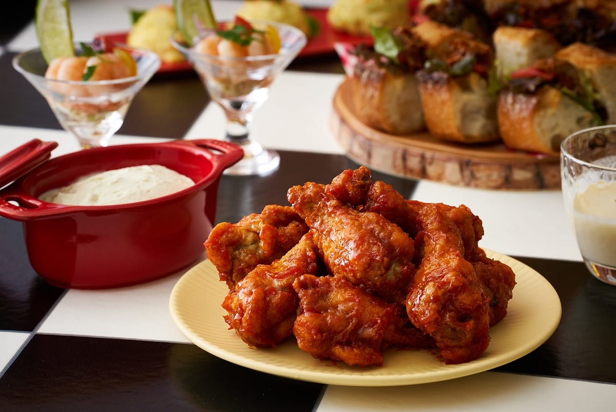 ブルーチーズソースをディップして食べる「バッファローチキンウィング」や