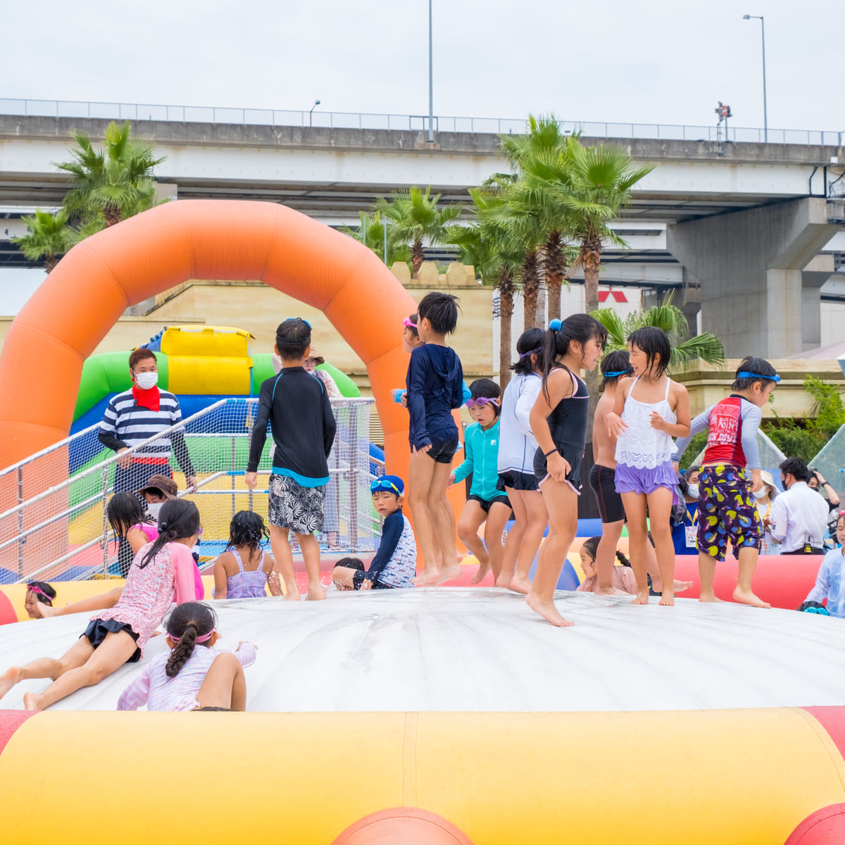 円形状の水中に浮かぶ、直径15メートルの巨大なバルーンに乗って遊べる「つるつるホッピング」