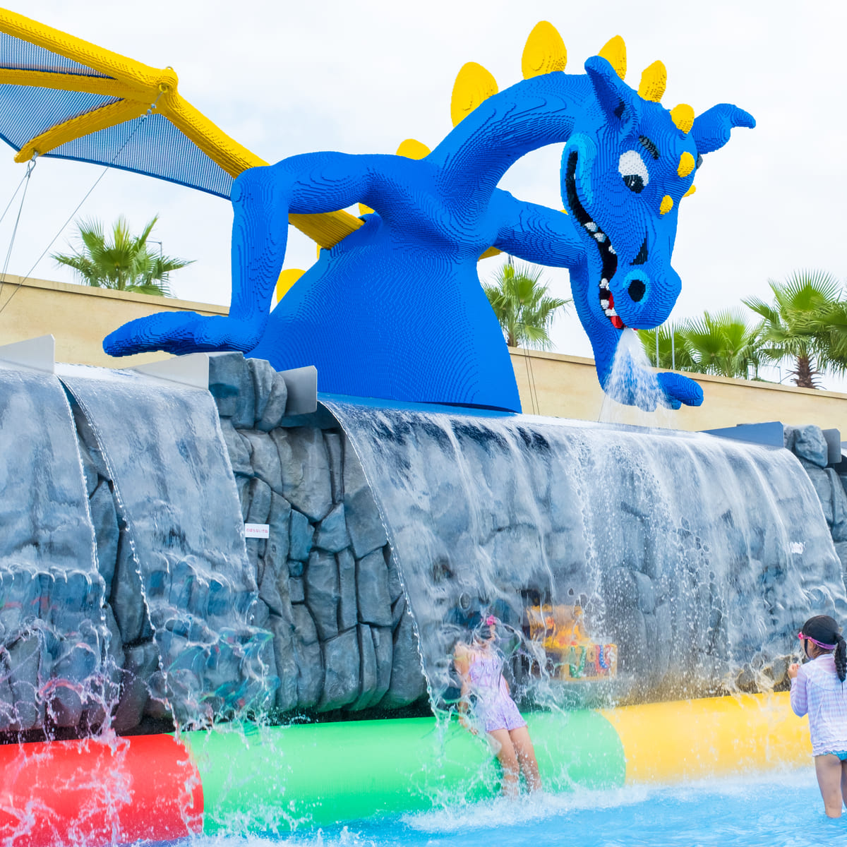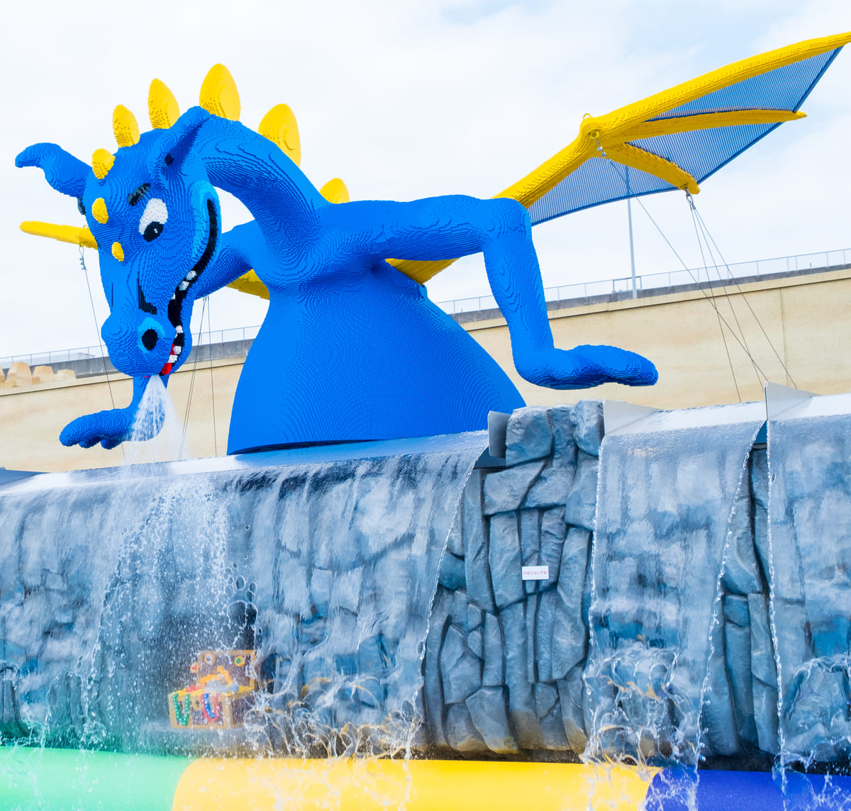 レゴ ブロック約6万6千個を使用した「ブロックゲート」をくぐると、新エリアにレゴ ブロック約32万個・高さ2.3mの巨大な青いドラゴンのオブジェをシンボルに、8つの冒険ゾーンの中に6つのアトラクションプールが広がります。