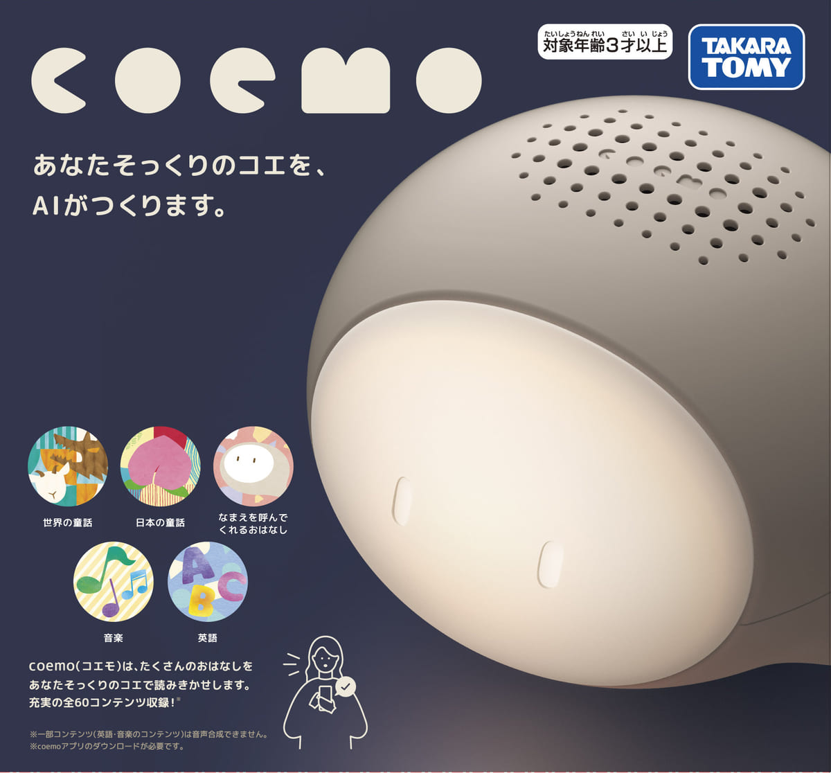 タカラトミーから、パパやママにそっくりのコエをAIがつくる読み聞かせスピーカー「coemo(コエモ)」が登場!