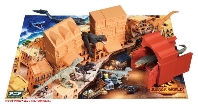 恐竜が建物を破壊する遊びや檻から脱出するなど、アニア「ジュラシック・ワールド」の世界で恐竜を使ってダイナミックに遊べる、情景パーツとプレイマップがセットになったグッズです。