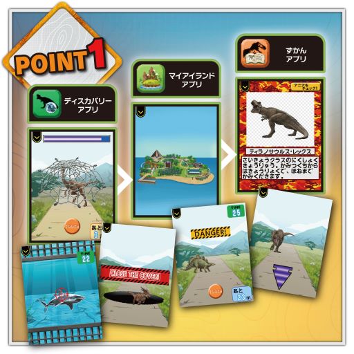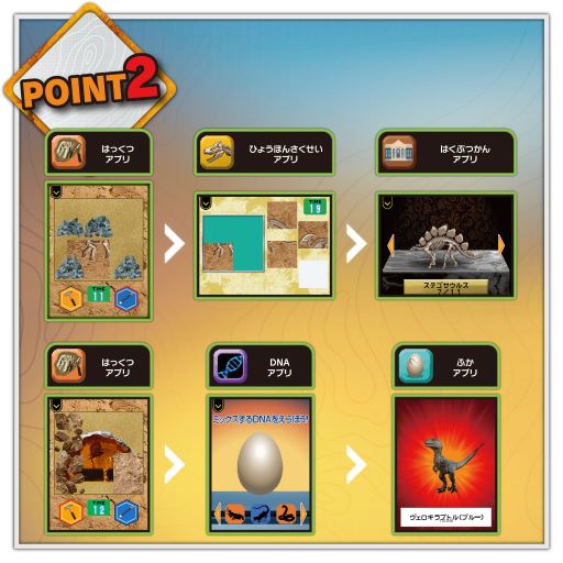 発掘では、琥珀を発掘してDNAを配合したり、恐竜を孵化・育成してバトルが楽しめます。