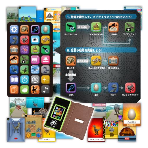 「ジュラシック・ワールド スマートガジェット ダイノゲート」は、恐竜の救出や育成、化石発掘、コレクション、バトル、DNA配合などができるアプリ全28種類が搭載されます。