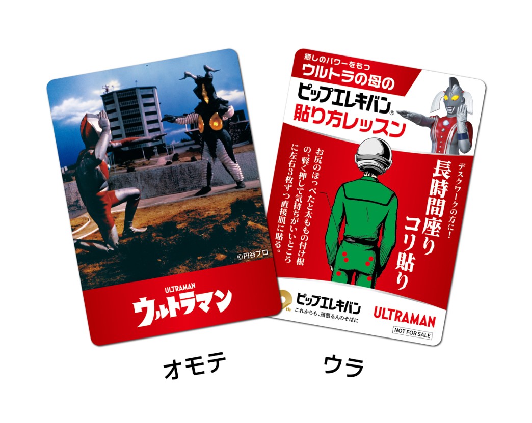 限定カードの表面には作中での名シーン、裏面は「ウルトラの母」が「ピップエレキバン」の貼り方を紹介するデザインになっています。