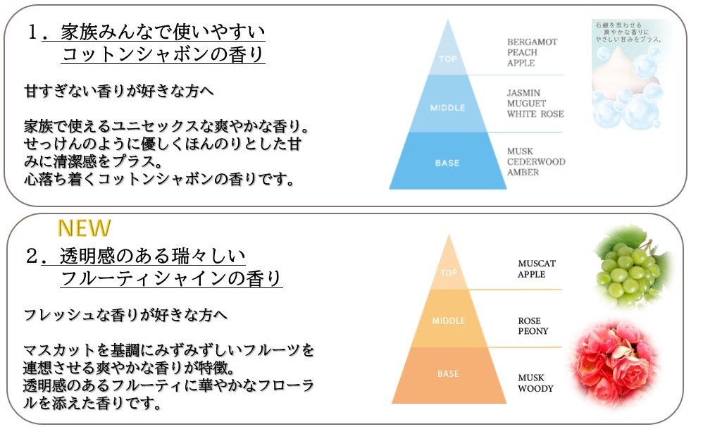 香りは、みんなが使いやすい爽やかな「コットンシャボン」と、みずみずしくフレッシュな香りが心地よい「フルーティシャイン」の2種が選べます。