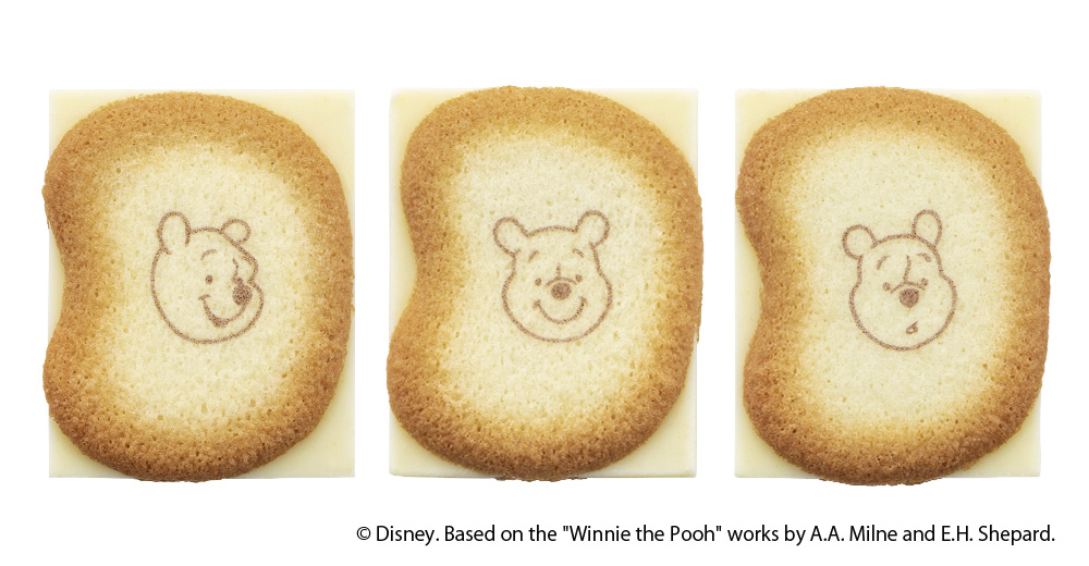 シャリシャリッと軽やかに焼きあげたラングドシャクッキーに描かれているのは、にっこり・横顔・おすましの3種類の「プーさん」デザイン。