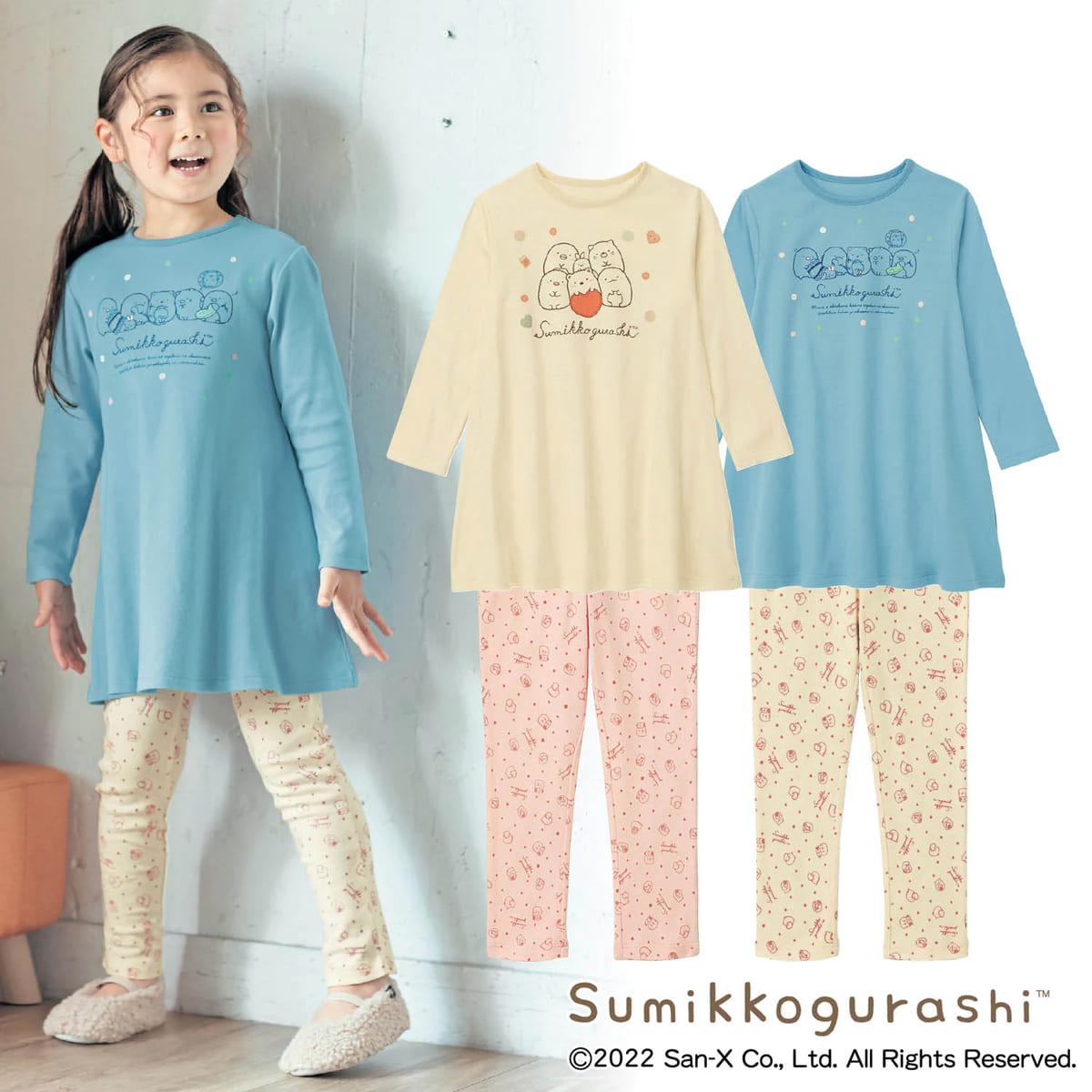 Aラインのトップスと「すみっコ」たちの総柄スパッツがかわいい、キッズサイズのルームウェア!