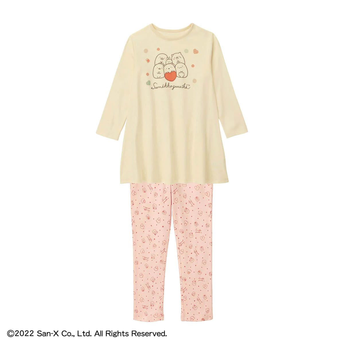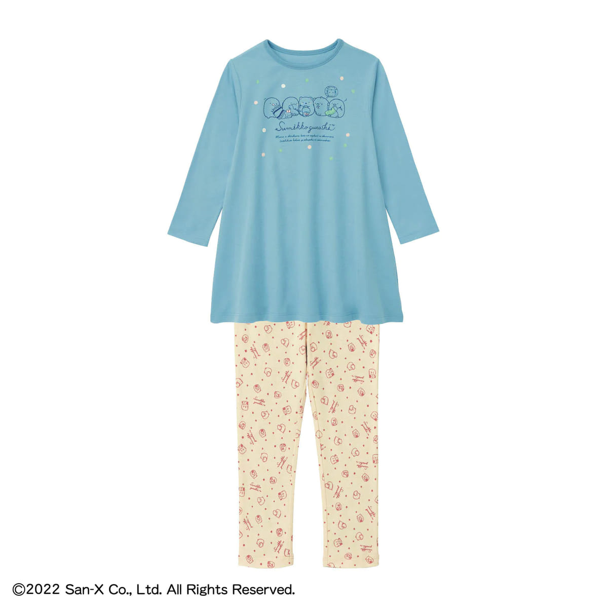 トップスは「すみっコぐらし」のキャラクター達が大きくプリントされ、ボトムスはにぎやかな総柄です。