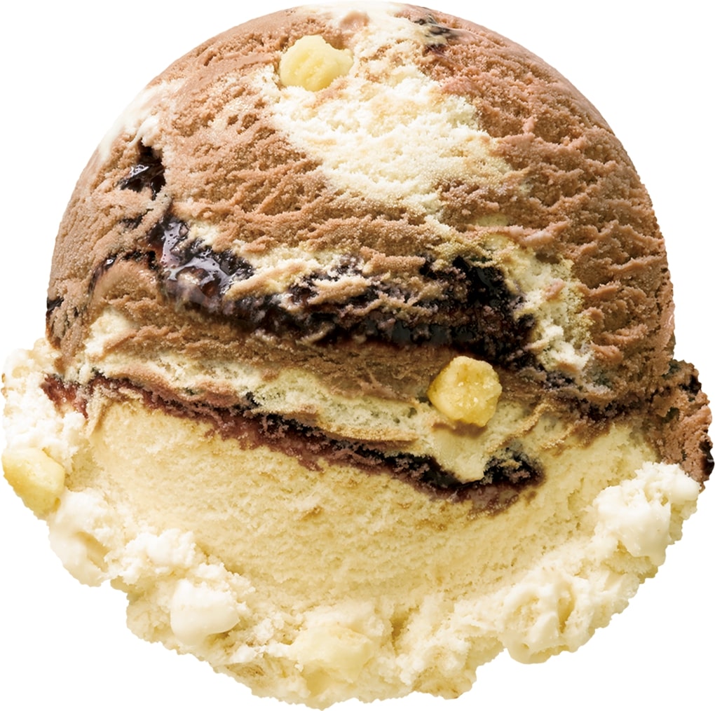 バタークッキー入りのマカデミアナッツ風味アイスクリームにミルクチョコレートアイスクリームを合わせ、さらにチョコレートリボンをトッピング。