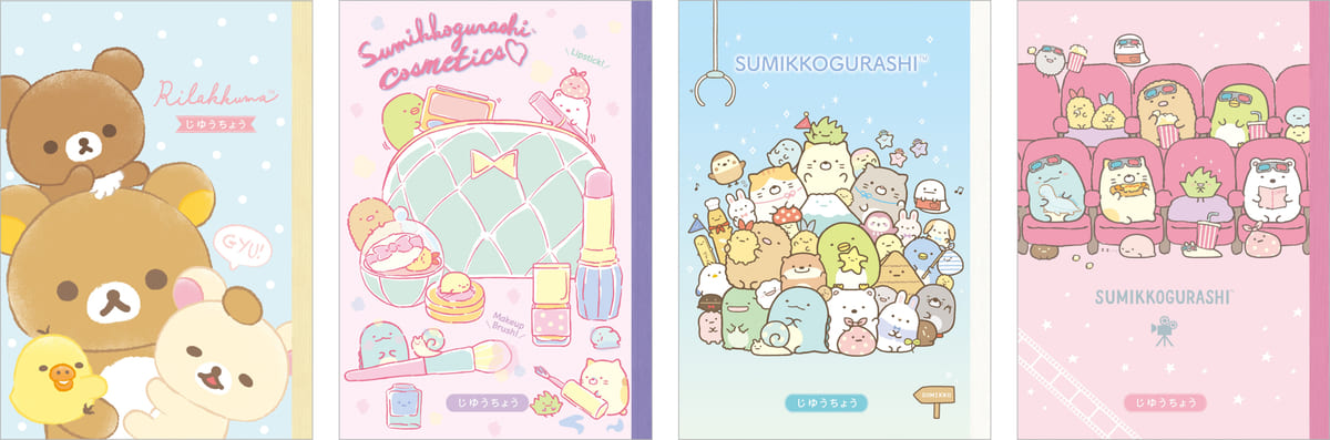 「すみっコぐらし」の自由帳は、コスメがいっぱいのガーリーなデザインと、「すみっコ」と「みにっコ」、さらにはお友だちも大集合したデザイン、さらにみんなで3D映画を楽しむデザインの3種類がラインナップされます。