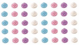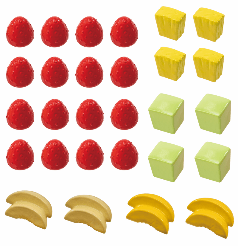 クリーム絞り器×1、クリーム(白・ピンク・水色・紫)各10粒×40、イチゴ×16、メロン・パイナップル 各4個×8、黄桃・白桃 各2個×4