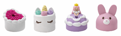 ケーキ型・ケーキピール・パーツトング 各1個×3、 ケーキ(白・ピンク・水色・茶色)各1個×4、 二段ケーキ、ミニケーキ(ユニコーン・うさぎ・ドール・チェリー)各1個×4