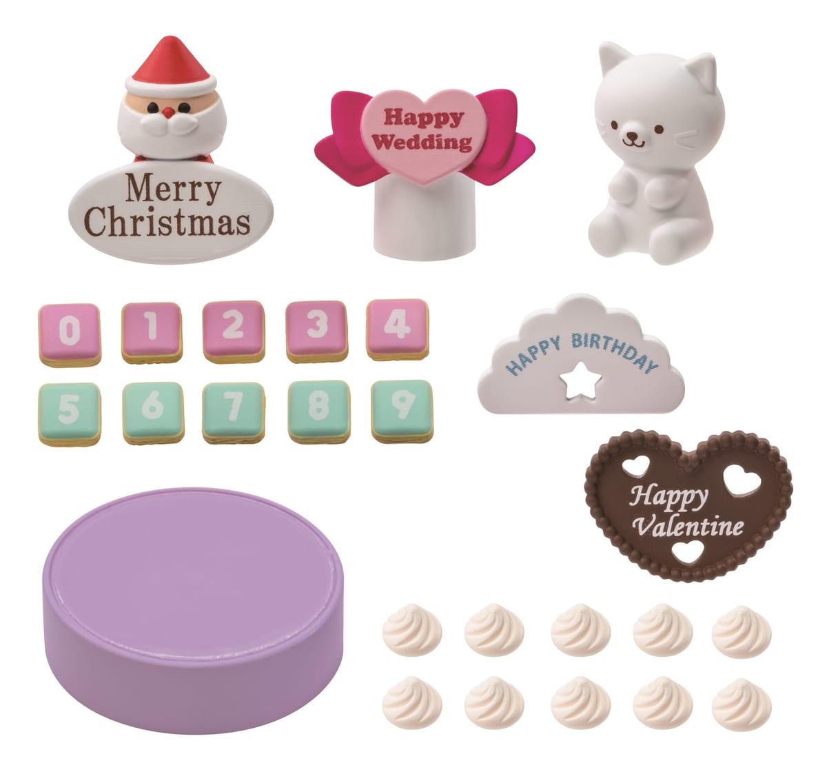 セット内容:ケーキ×1、ホイップクリーム×10、ウエディングケーキ×1、ねこ×1、サンタ×1、バースデープレート×1、バレンタインプレート×1、数字クッキー(0~9)×10