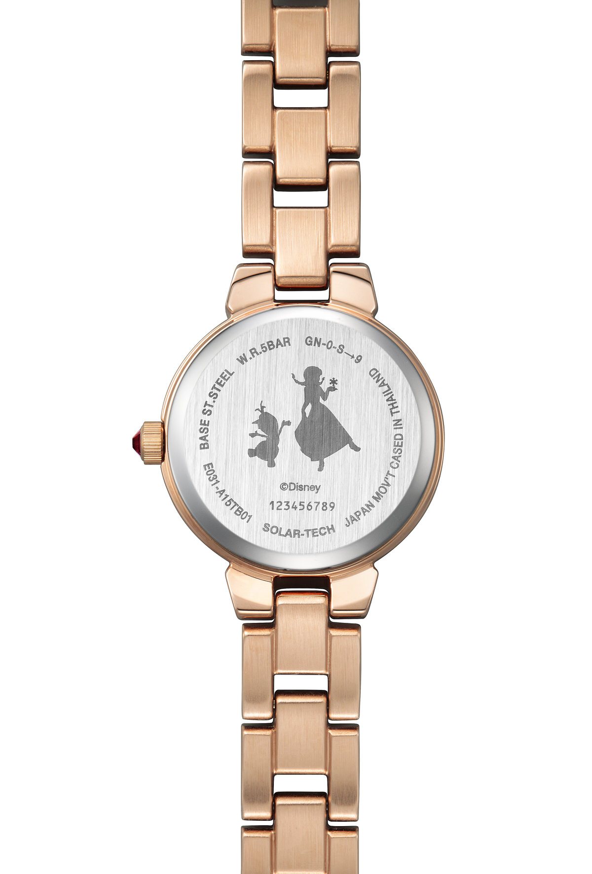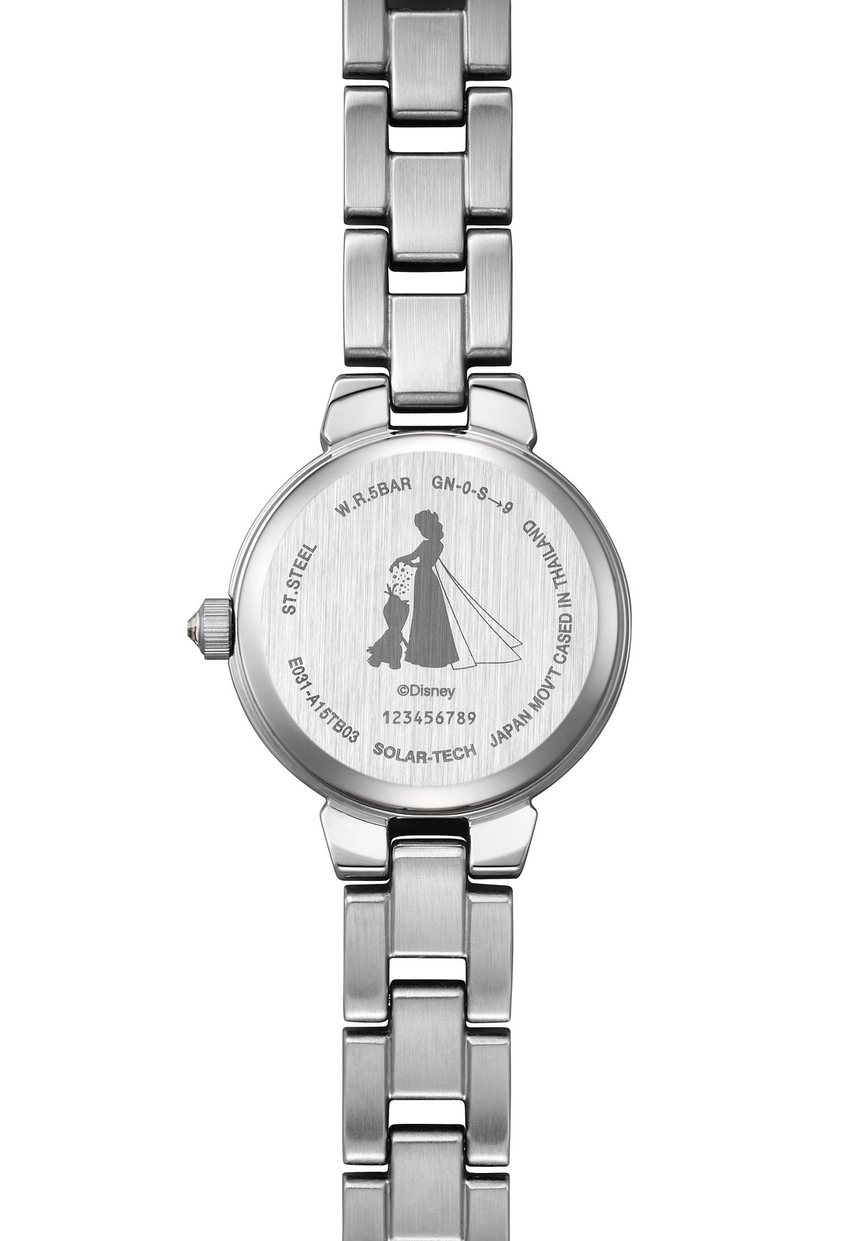 文字盤やりゅうず、裏ぶたの刻印にも「アナ」や「エルサ」のイメージが散りばめられたスペシャルモデル。