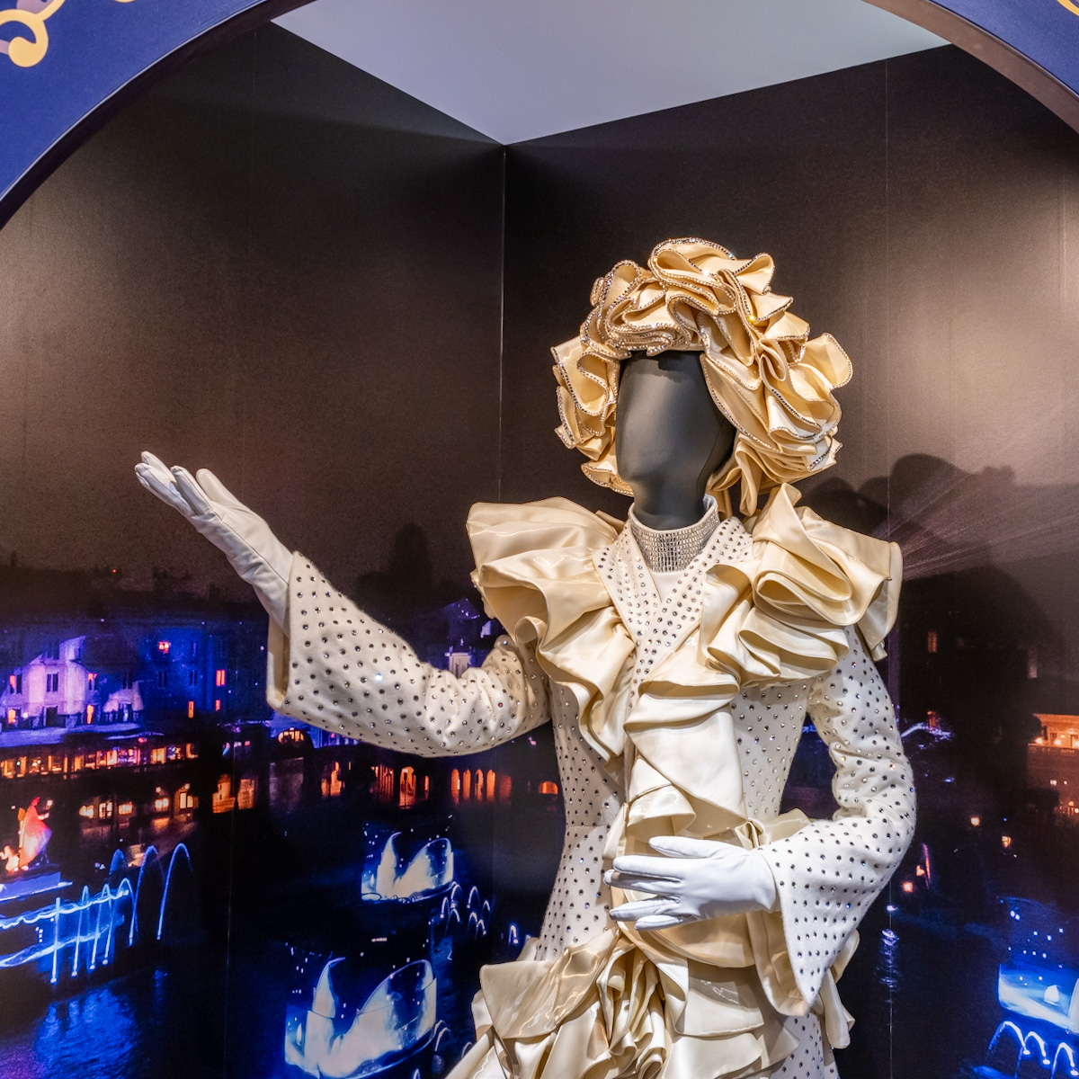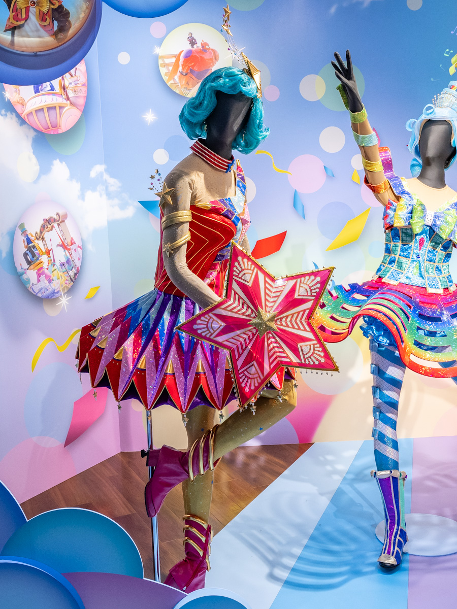 続く3つの展示区画では、それぞれ異なるテーマのもと、12種類のエンターテイメントプログラムやスペシャルイベントの感動の瞬間を、音楽や映像に加え、60着以上の懐かしいエンターテイメントコスチュームで表現します。
