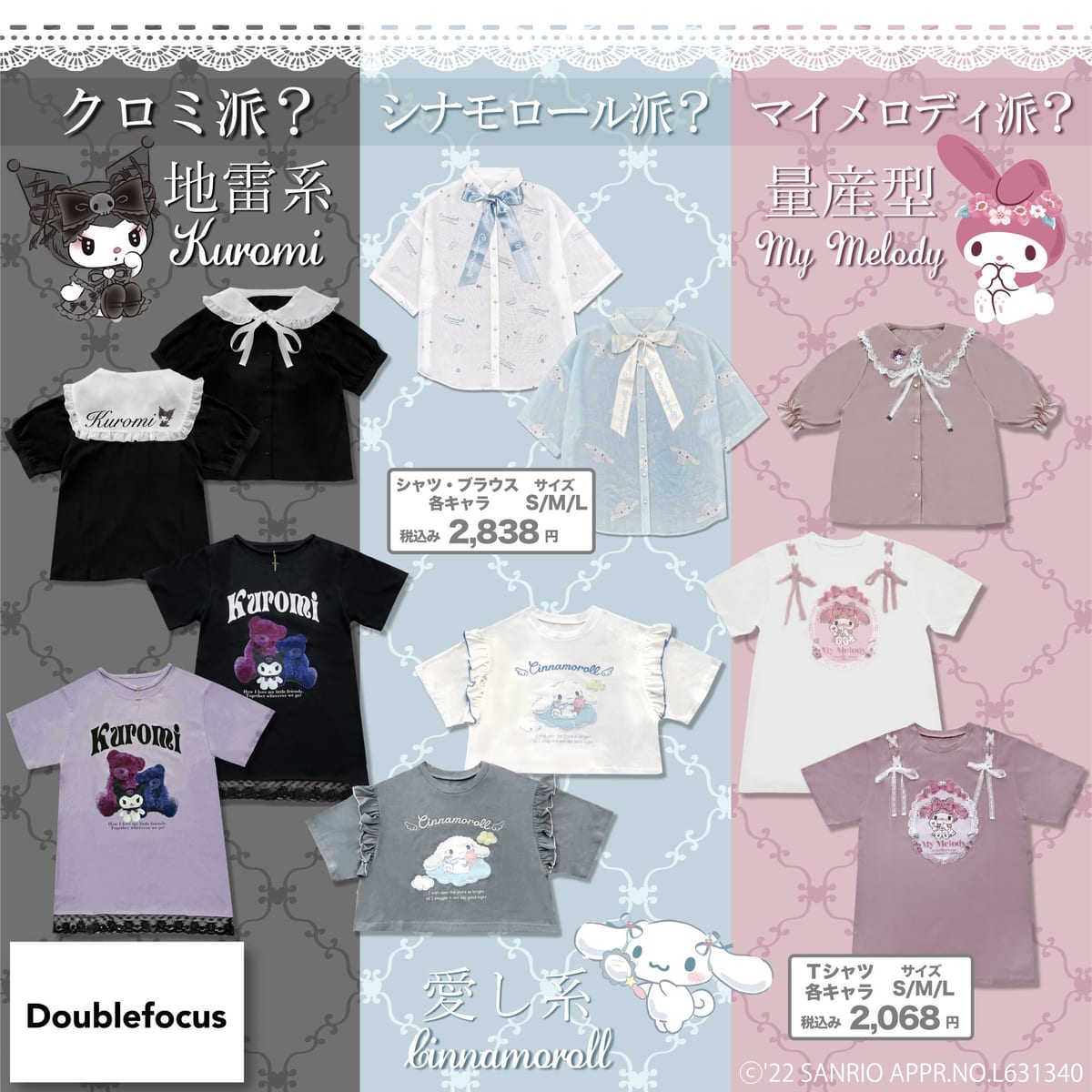 イオンの Doublefocusブランドから2022年6月11日より順次発売される、「マイメロディ×量産型」「シナモロール×愛(いと)し系」「クロミ×地雷系」3種のファッションアイテムの紹介でした☆