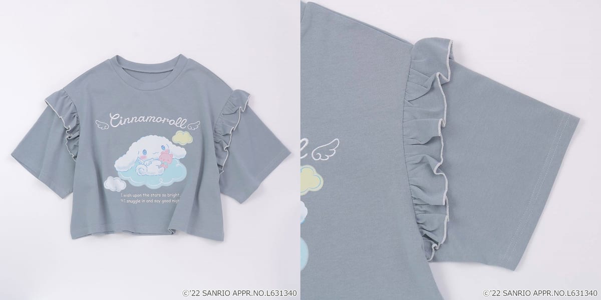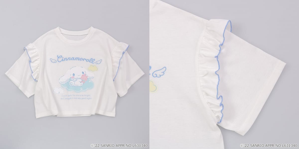 肩のフリルがキュートなTシャツに、「シナモロール」が大きくデザインされています。