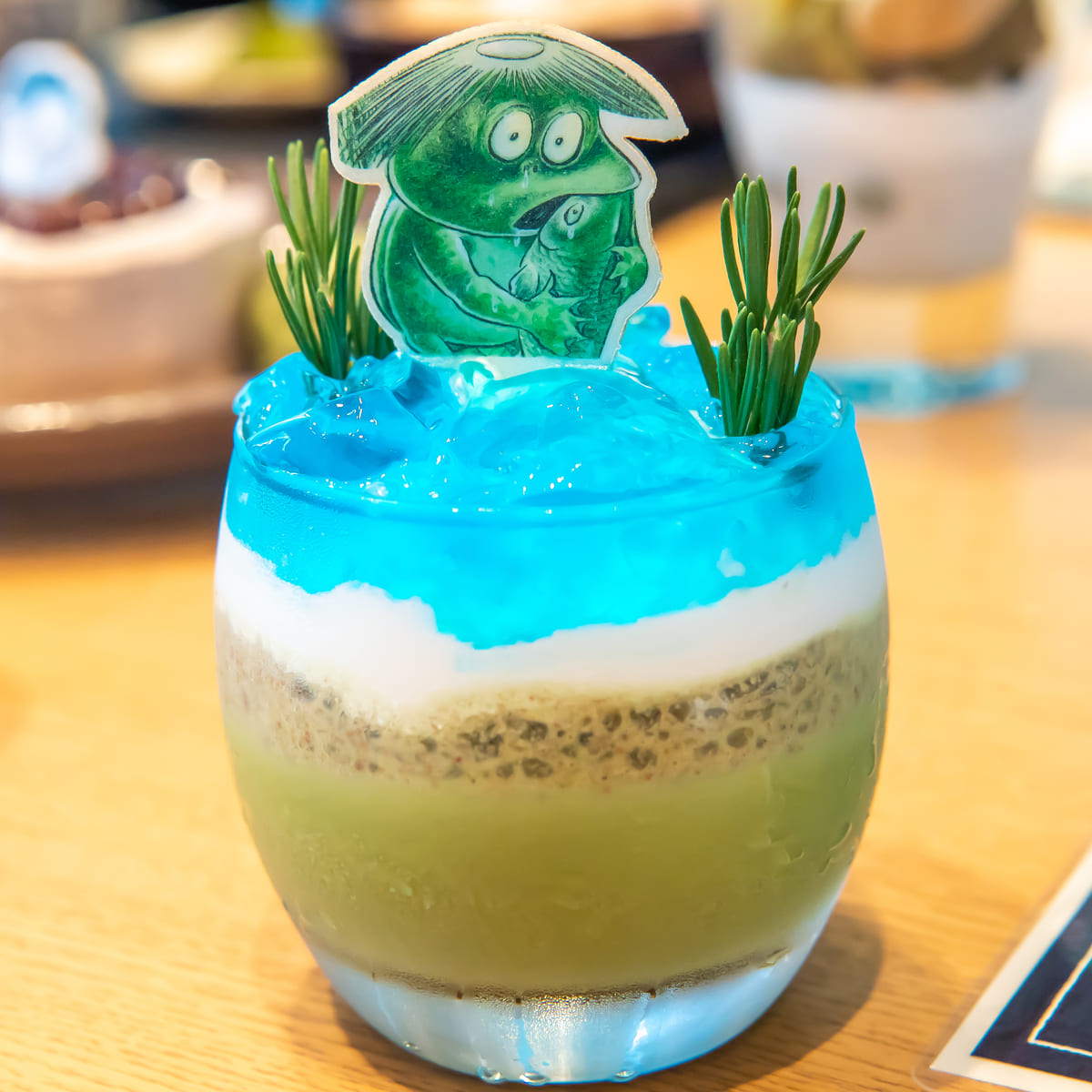 メロンシロップとミントで妖怪達の住む森をメロンソーダ風に表現した「⻤太郎と⼀反もめんのお空の散歩」