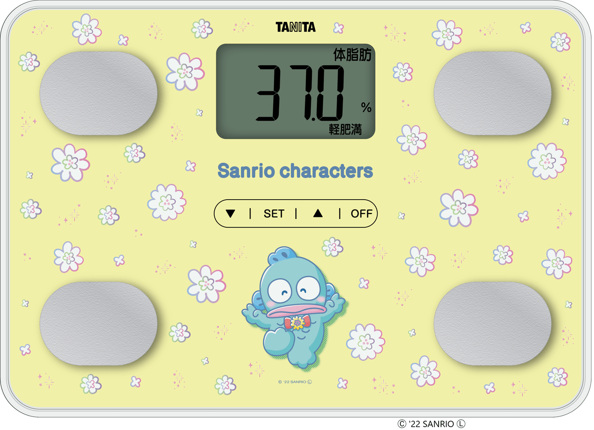 体組成計本体のデザインは、柔らかな色彩のイエローをベースカラーに「2022年サンリオキャラクター大賞」オリジナルデザインのにこやかな表情を浮かべたキャラクターのイラストを中央に配置し、その周りに小花があしらわれています。