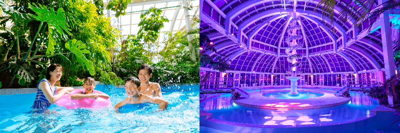 天候を気にせずに楽しめる室内型プール「森のプール」は、南国の植物が生い茂りリゾート感満載!