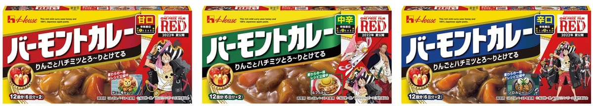 「こくまろカレー」「バーモントカレー」「完熟トマトのハヤシライスソース」「咖喱屋(カリー屋)シリーズ」「フルーチェ」の5ブランドで、『ONE PIECE FILM RED』とのタイアップパッケージ全12種類が登場!