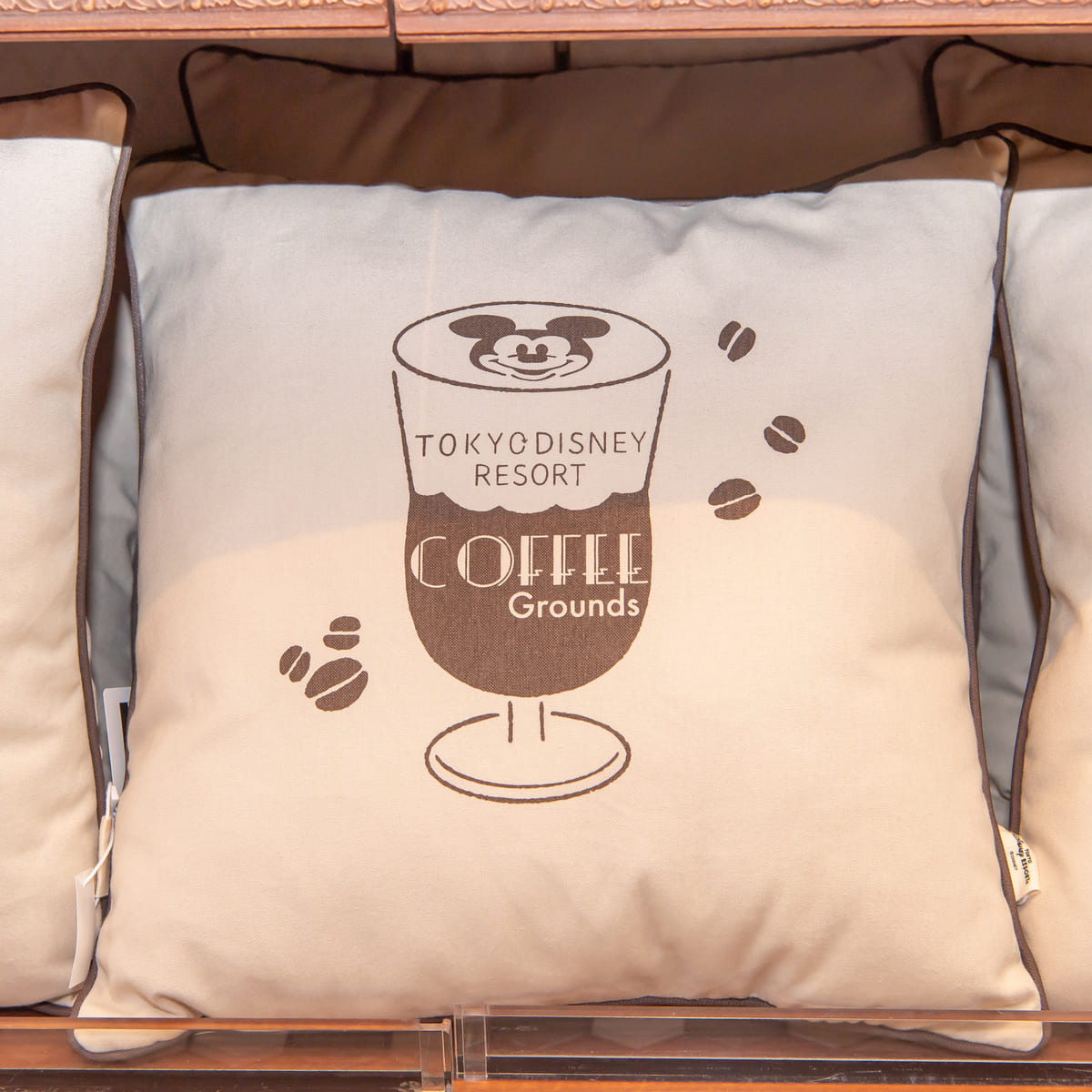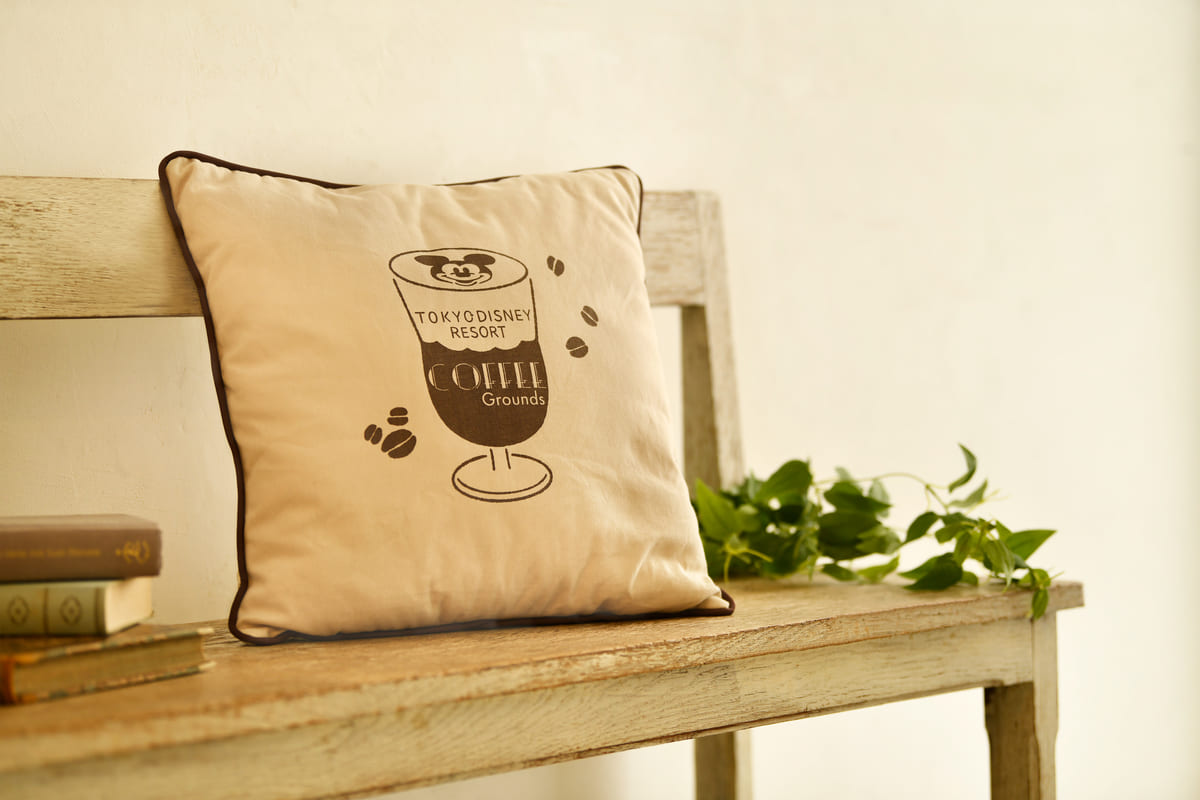 コーヒードリンクとミッキーシェイプのコーヒー豆がデザインされたクッション。