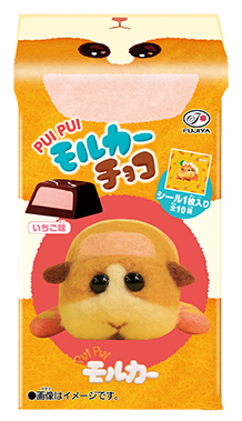 ストロベリークリームを閉じ込めたミルクチョコレートと、シールが1枚ついた「PUI PUI モルカーチョコ」