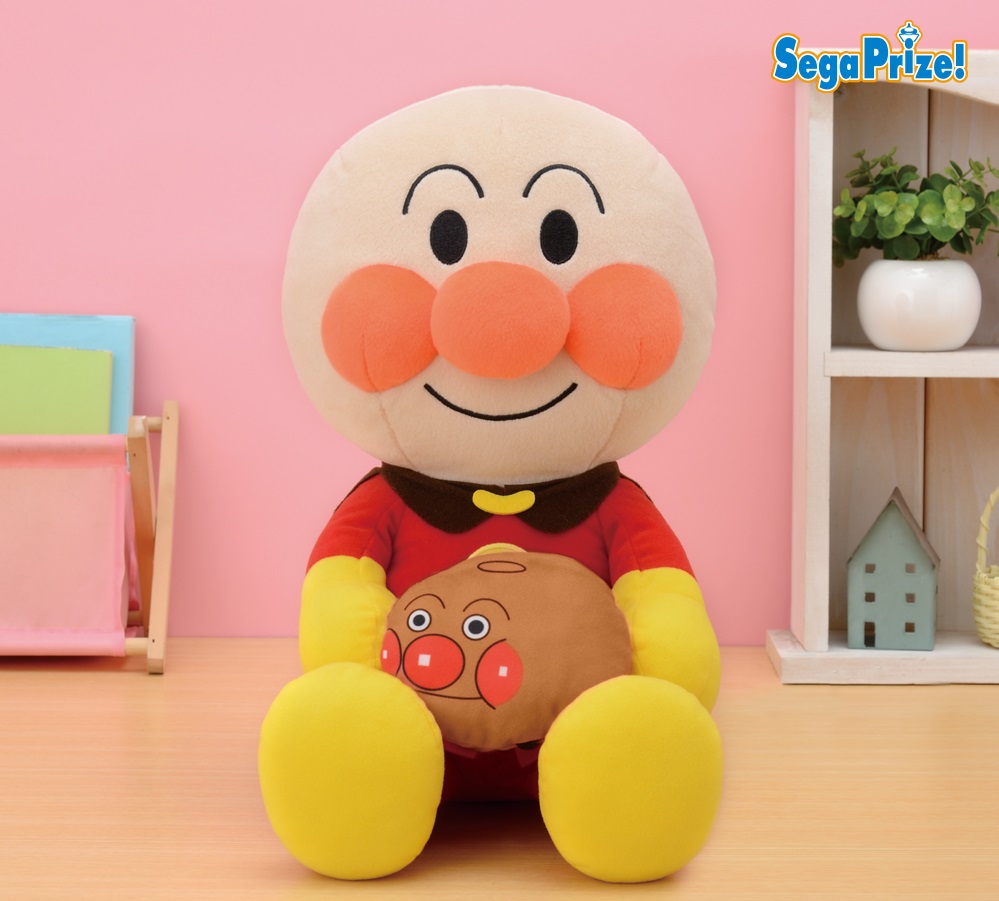 画像の「それいけ!アンパンマン メガジャンボのりもの小物入れぬいぐるみ」などの「アンパンマン」の景品が入っているクレーンゲーム機のほか、