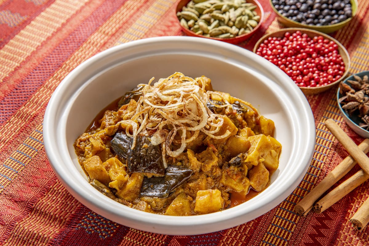 茄子とジャガイモのカレー「アルーバインガン」は、ガーリック、ジンジャー、グリーンチリ、クミンシード、コリアンダーパウダーなど、多彩なスパイスが複雑に絡み合うセミドライカレー。