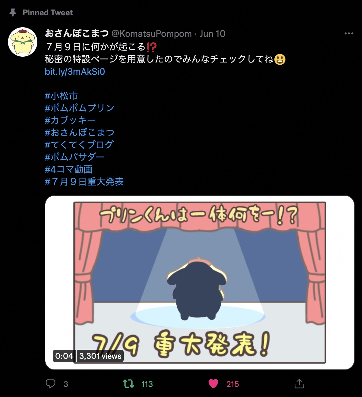 「ポムポムプリン」の石川県小松市応援隊長『小松もう大好き!隊長』就任イベントの紹介でした。