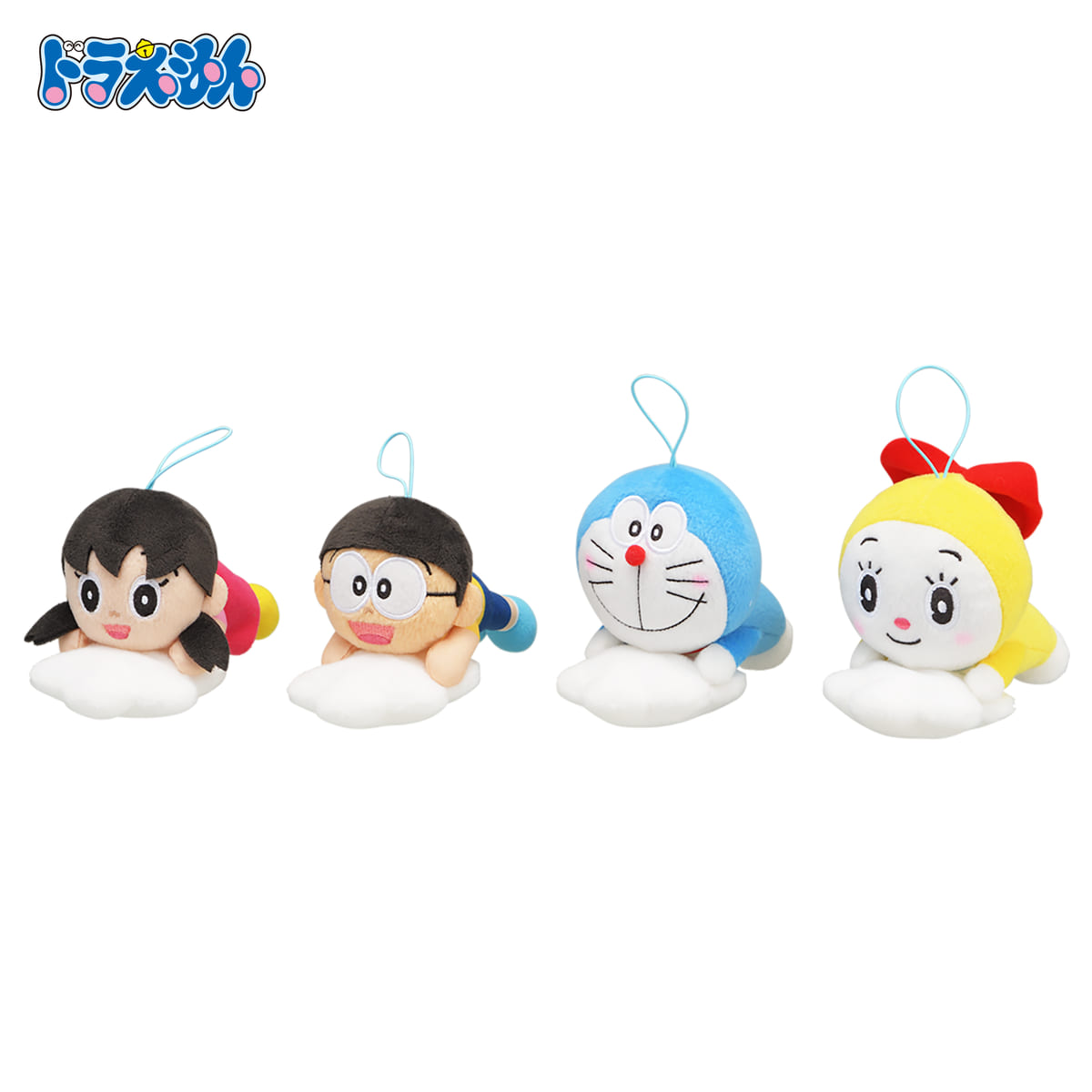 雲に乗ってみんなでぷかぷか遊んでいる「ドラえもん」たちのぬいぐるみ。
