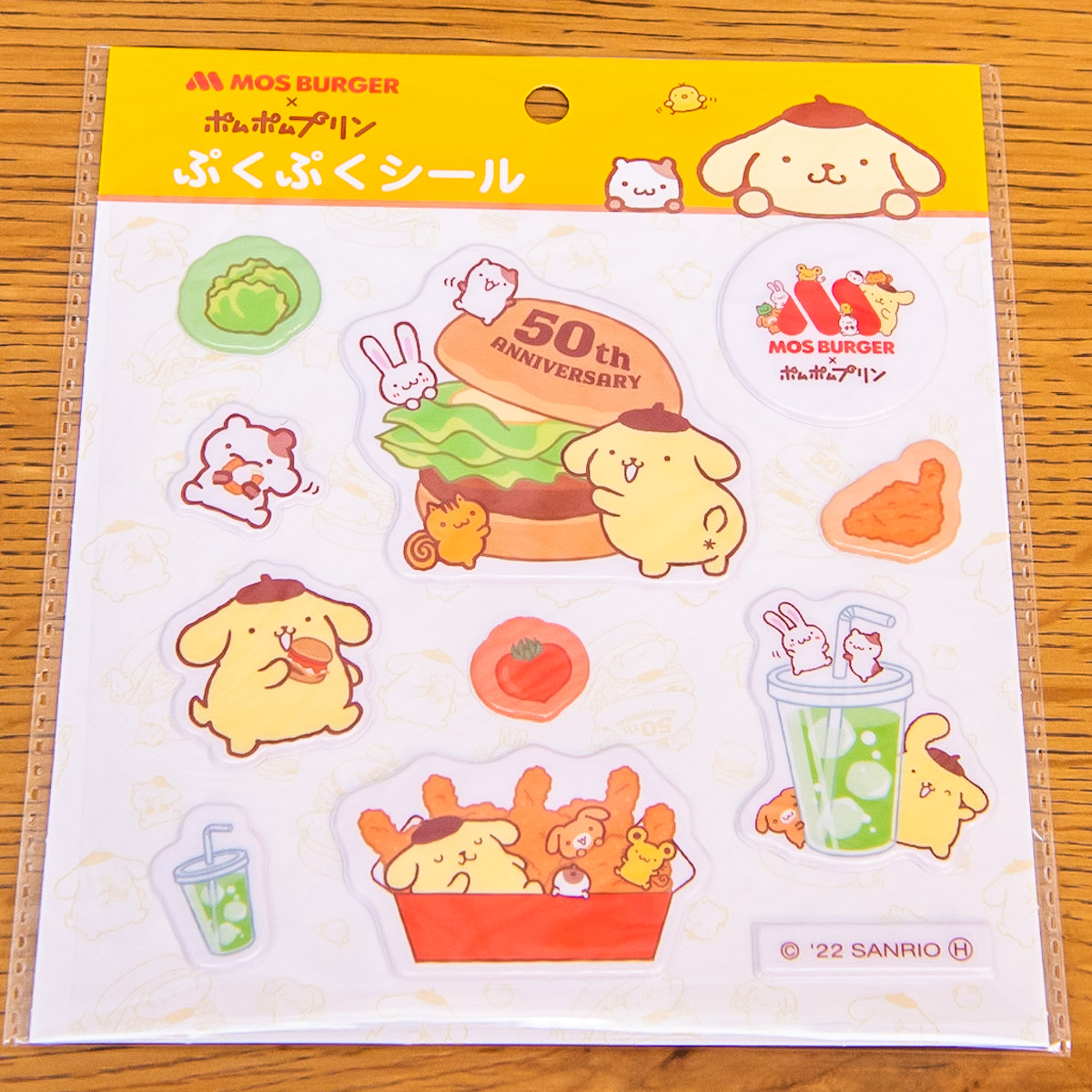 モスバーガーの人気メニューと一緒にポムポムプリンたちが描かれたシールです。