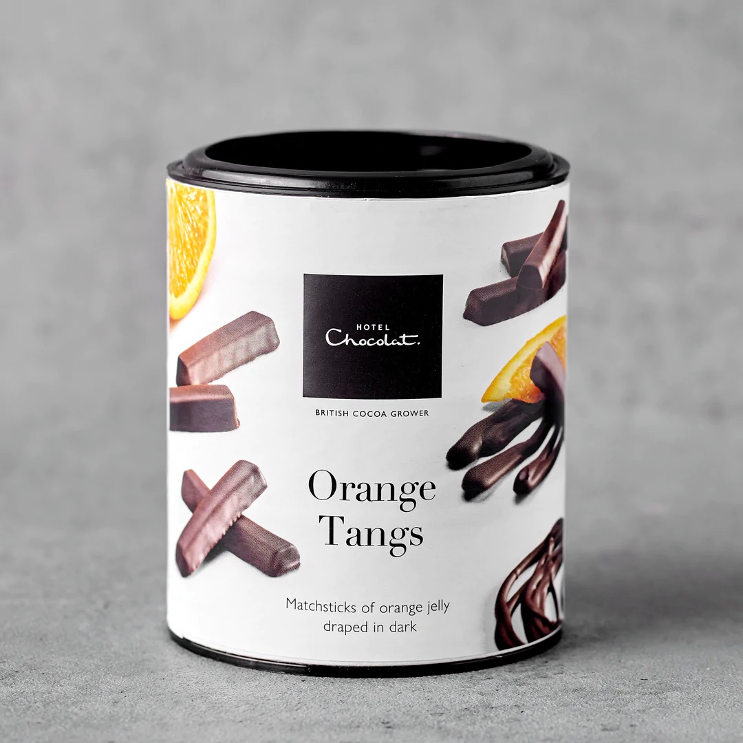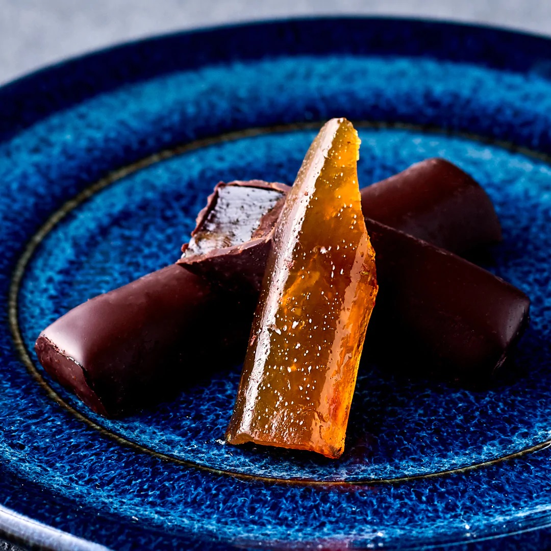 マッチ棒状のオレンジジェリーを、70%ダークチョコレートで包んだ「オレンジ タング」