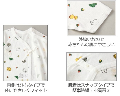 肌着は着心地や赤ちゃんのお肌への刺激を考え、袖・脇部分が外縫いになった肌にやさしい仕様です。