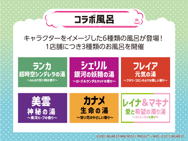 「シェリル・ノーム」と「ランカ・リー」、ワルキューレの5人をそれぞれイメージした6種類のコラボ風呂が登場。