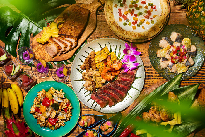 レストラン内のオープンキッチンで調理する「ハワイ風グリル」をはじめ、「ハワイアンププ」をイメージした前菜の数々が並びます☆