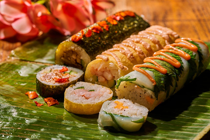 カリフォルニアロールに見立てた「ハワイアンカラフル寿司」は、リーベル風にアレンジ。