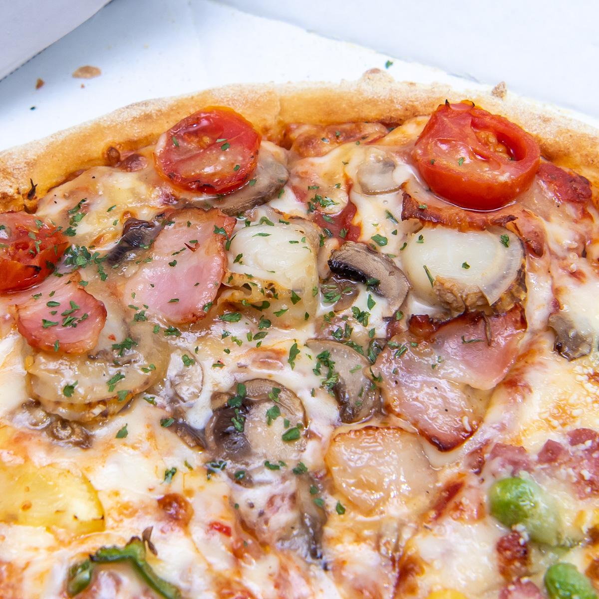 厳選した肉厚のホタテとマッシュルーム、ベーコン、トマトといった具材でアヒージョ風に仕上げられたピザ。