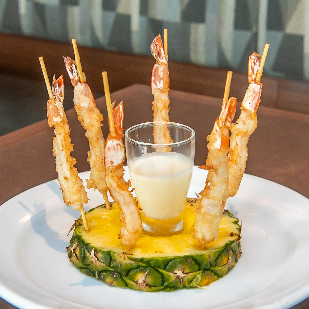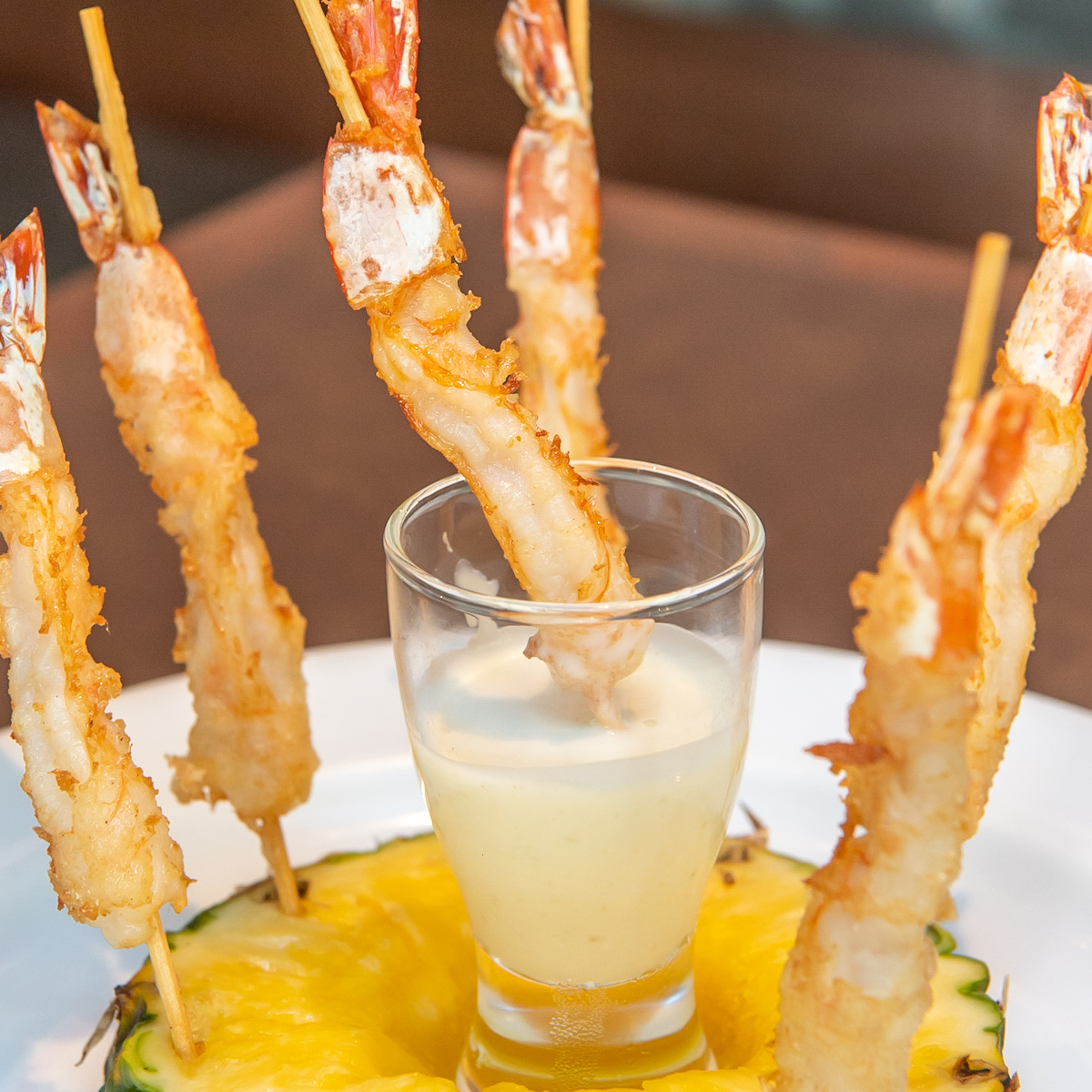 プリップリの海老をフリットにし、輪切りにしたパイナップルに刺して提供。