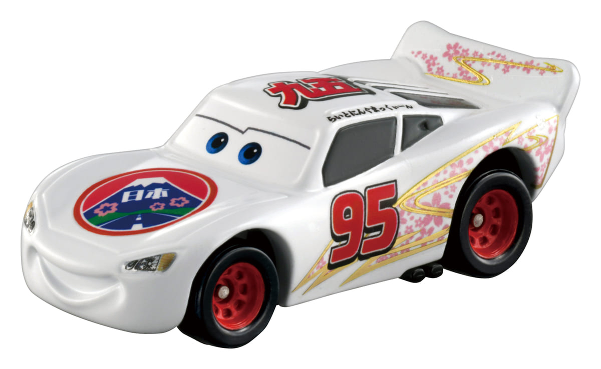 白と赤のカラーリングで日本をツーリングする「ライトニング・マックィーン」を表現したトミカ。