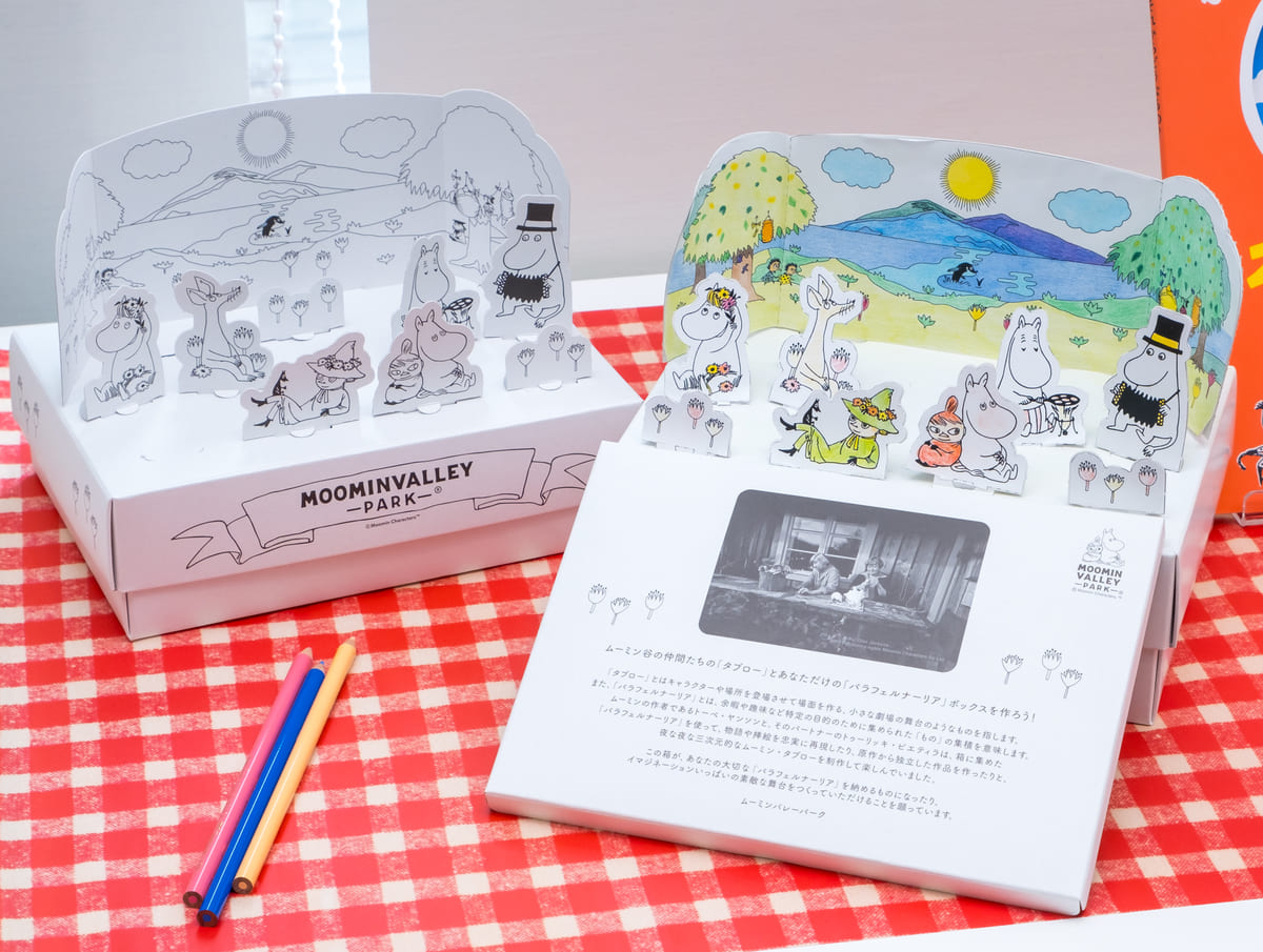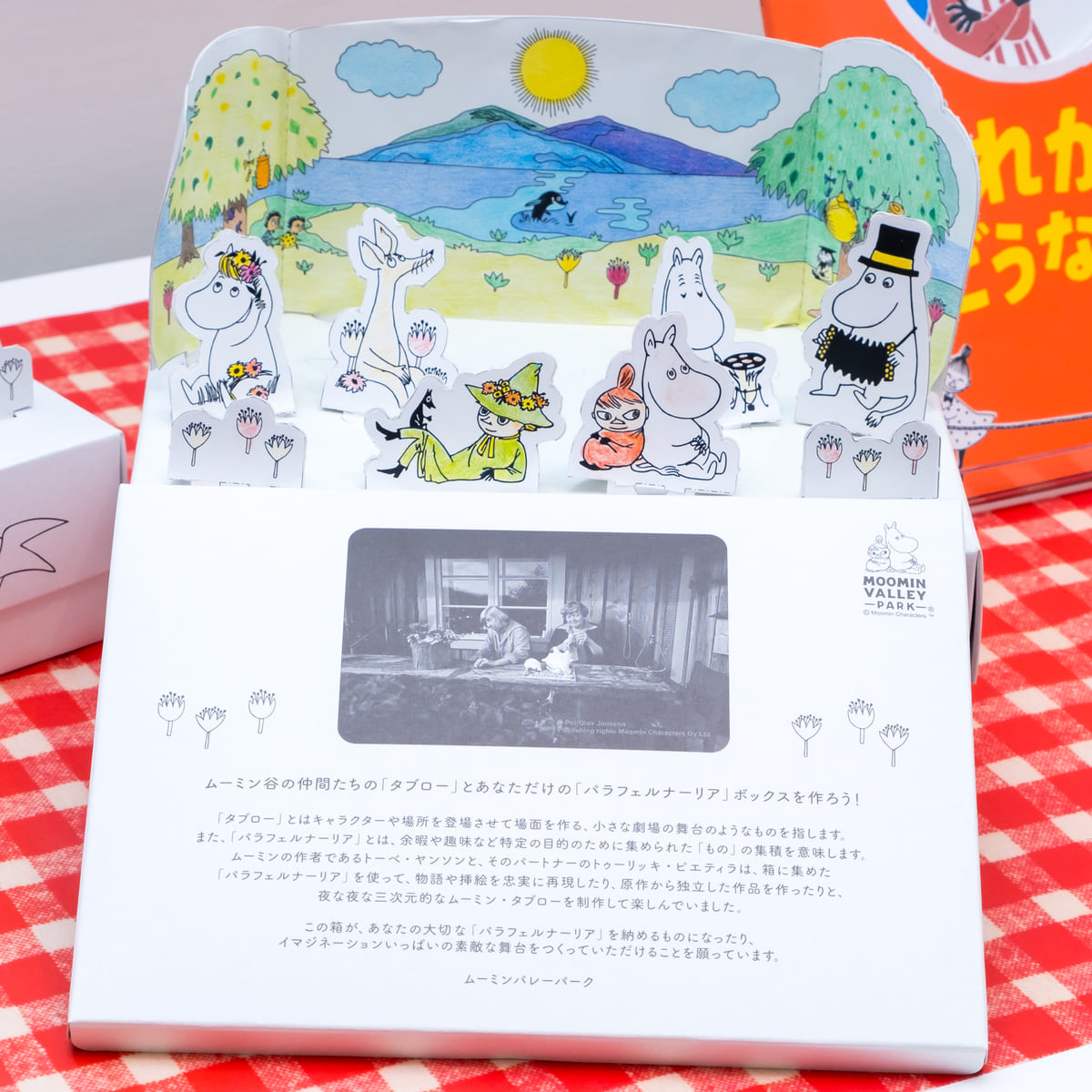 『ムーミン』の作者である「トーベ・ヤンソン」と、そのパートナーの「トゥーリッキ・ピエティラ」は、箱に集めた「パラフェルナーリア」を使って夜な夜な三次元的なムーミン・タブローを制作して楽しんでいたことに由来して、オリジナルのぬりえボックスが完成。