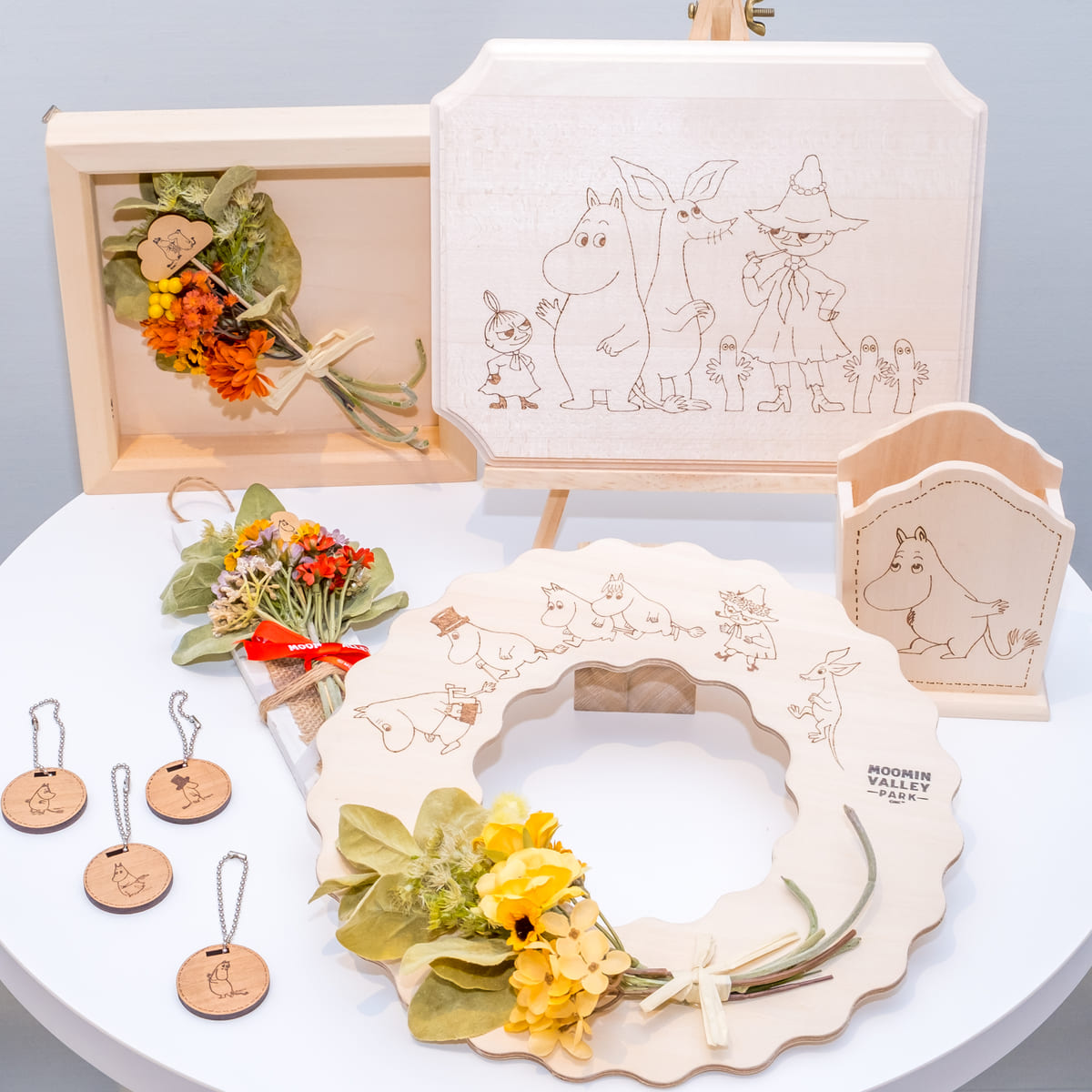 「ムーミン」のキャラクターや自然の葉っぱなどで飾り付けて、オリジナルの一枚が作れます。