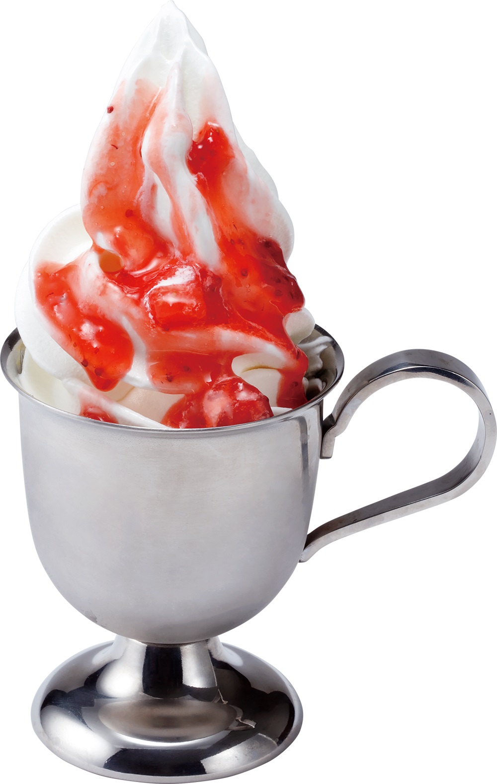 びっくりドンキーのデザートメニューやドリンクメニューでも評判の高い「イチゴソース」がかかった、目にも鮮やかなソフトクリーム。
