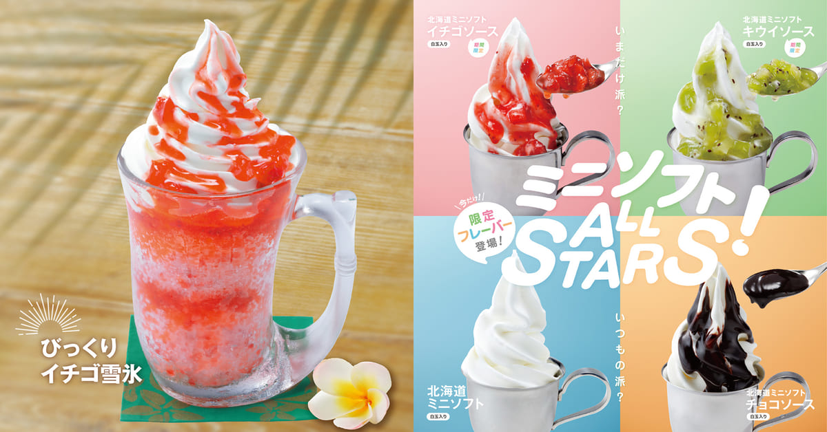 また、北海道ミニソフト・ソフトクリームと北海道ミニソフト・ソフトクリーム(チョコソース)に加え、2つの限定フレーバー「イチゴソース」「キウイソース」が登場。
