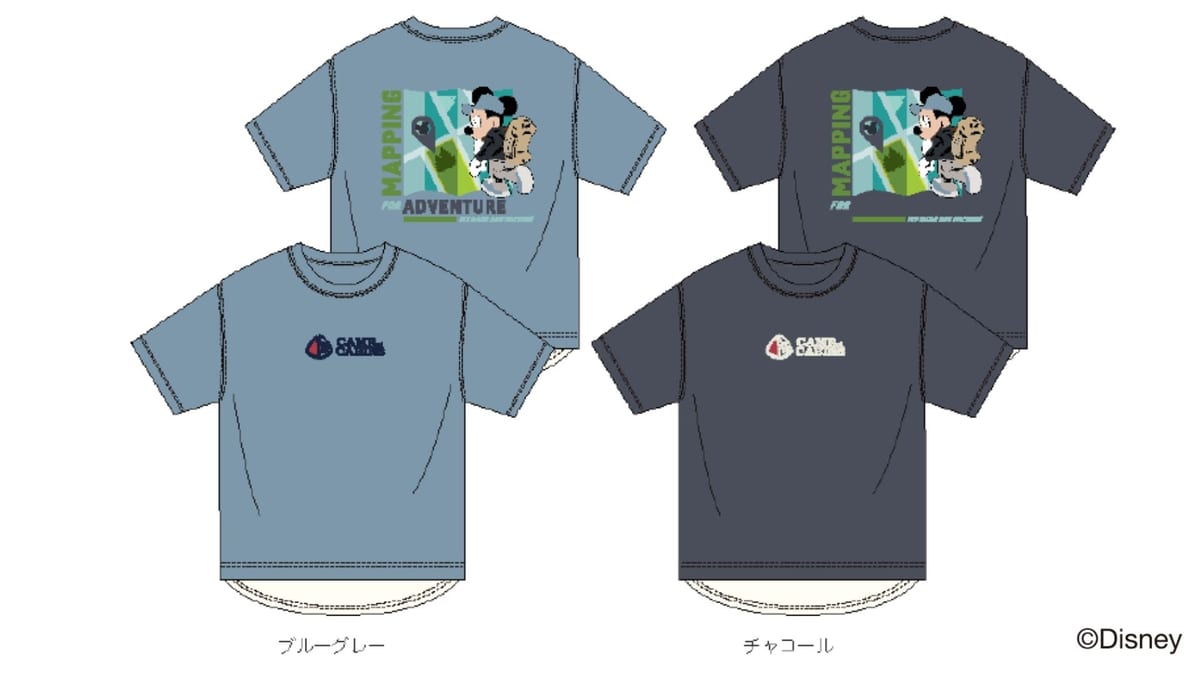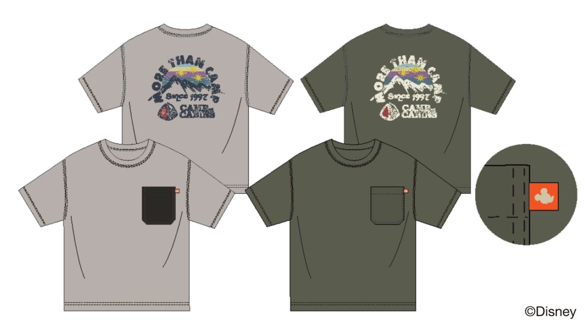 イラストが入った「CAMP&CABINS」のかすれたロゴが目を引くTシャツは、「ミッキーマウス」のタグがさりげなく光るデザイン。