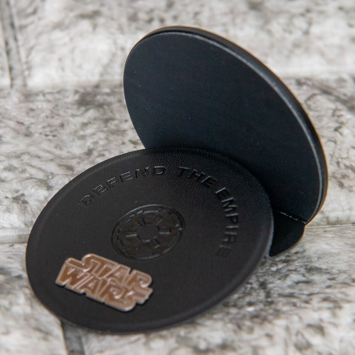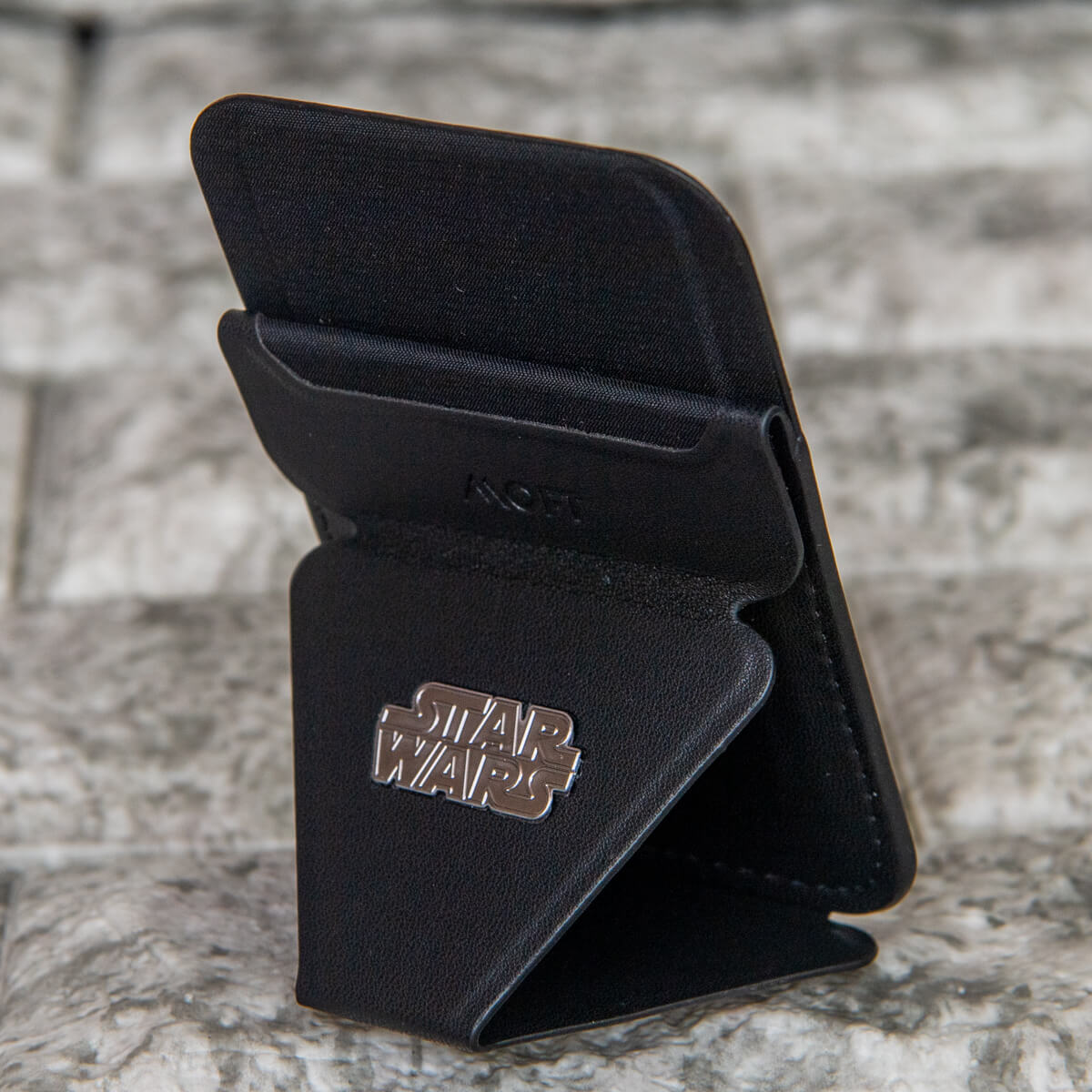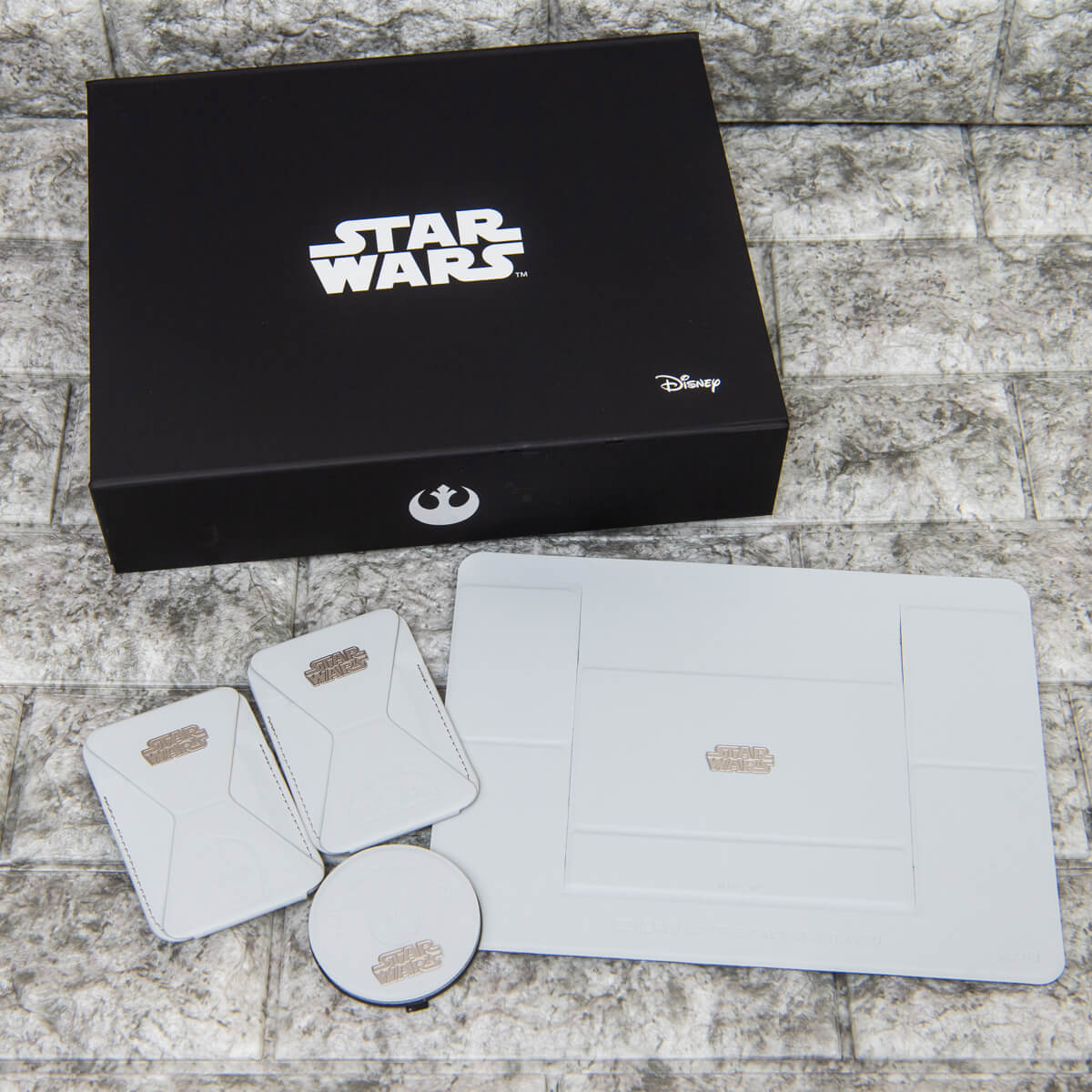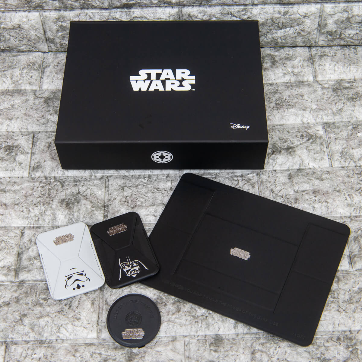 「帝国軍ボックス」の「MOFT O Snap スマホスタンド」は「帝国軍」のシンボルがプレス加工されたクールなデザイン。