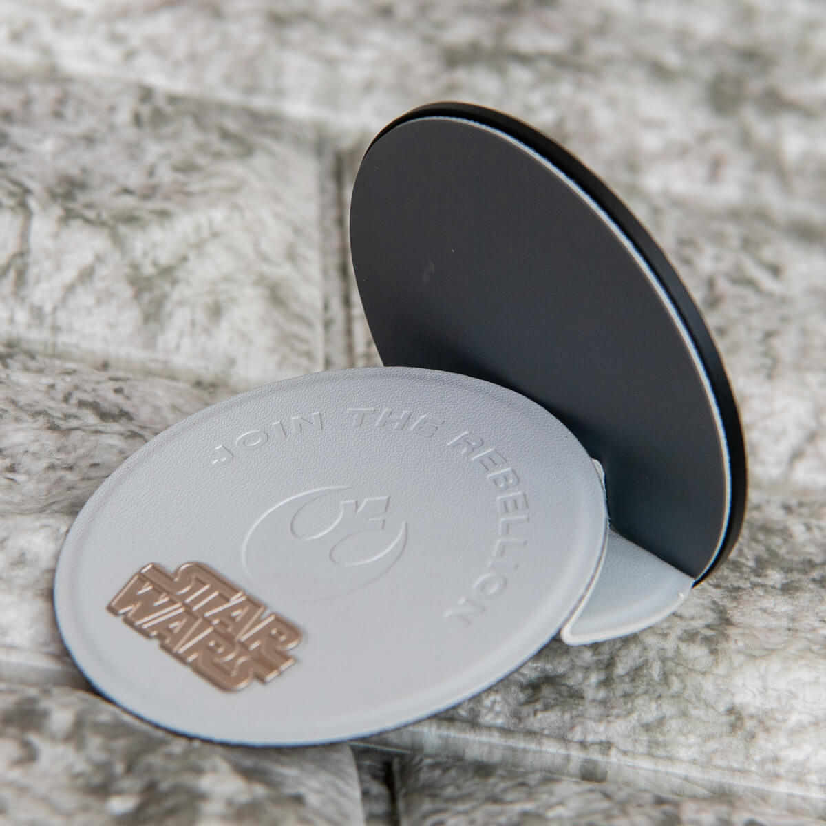 「反乱軍ボックス」に入った「MOFT O Snap スマホスタンド」は「反乱軍」のシンボルをプレス加工で表現。