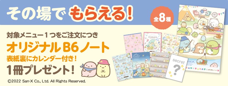 牛めし・カレー・定食などを販売する「松屋」、とんかつ専門店「松のや・松乃家」、カレー専門店「マイカリー食堂」各店舗にて、2022年に10周年を迎えた「すみっコぐらし」とコラボしたオリジナルB6ノートをプレゼント!