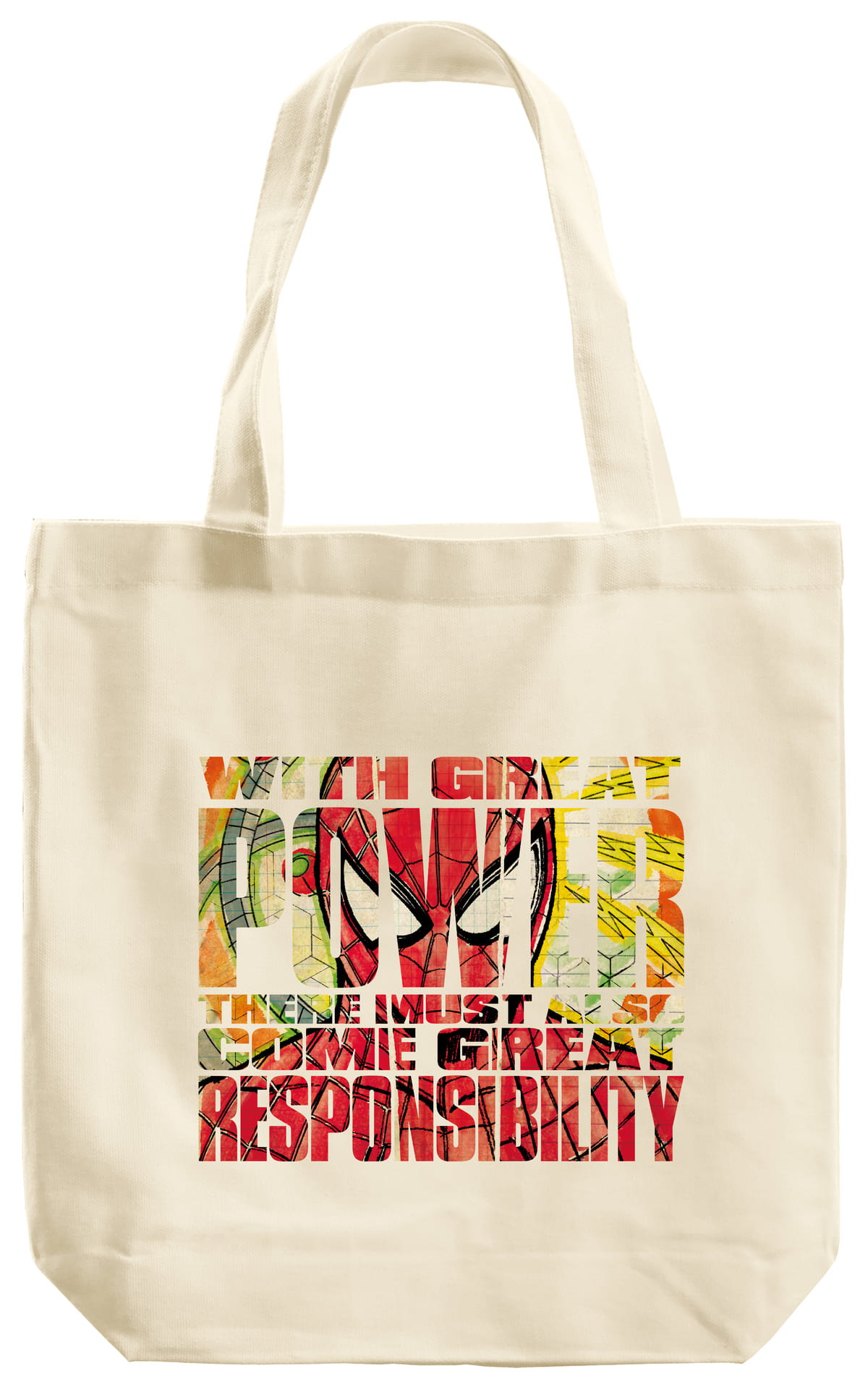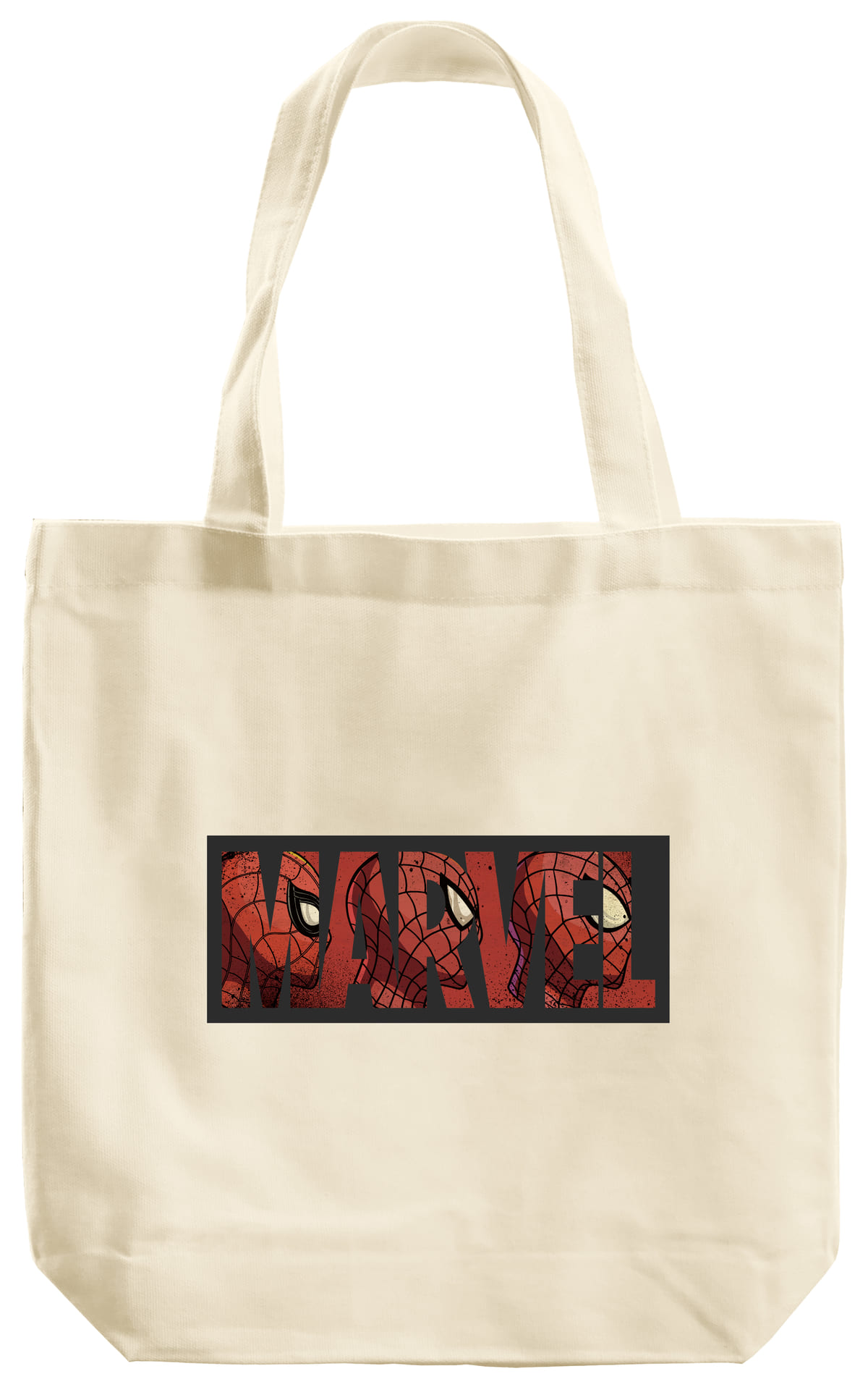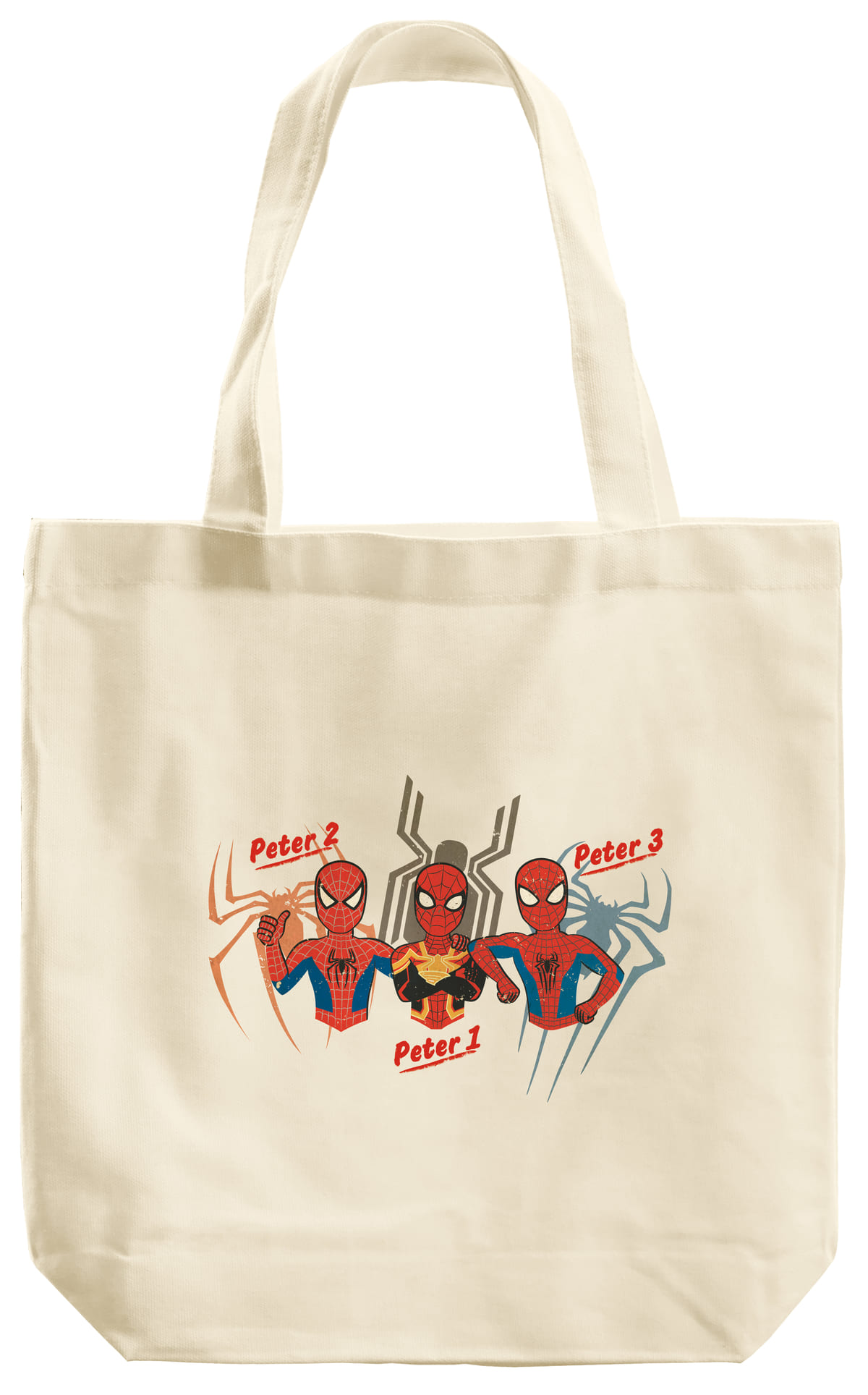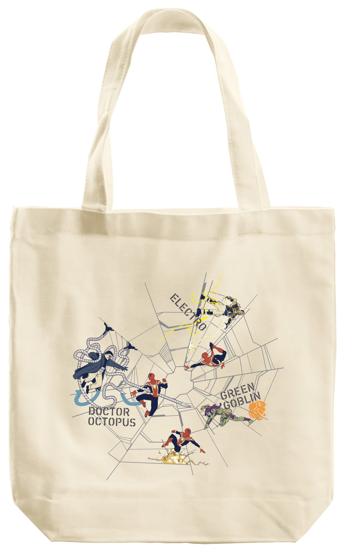 MARVELロゴと共に、3人の「スパイダーマン」が描かれたトートバッグや